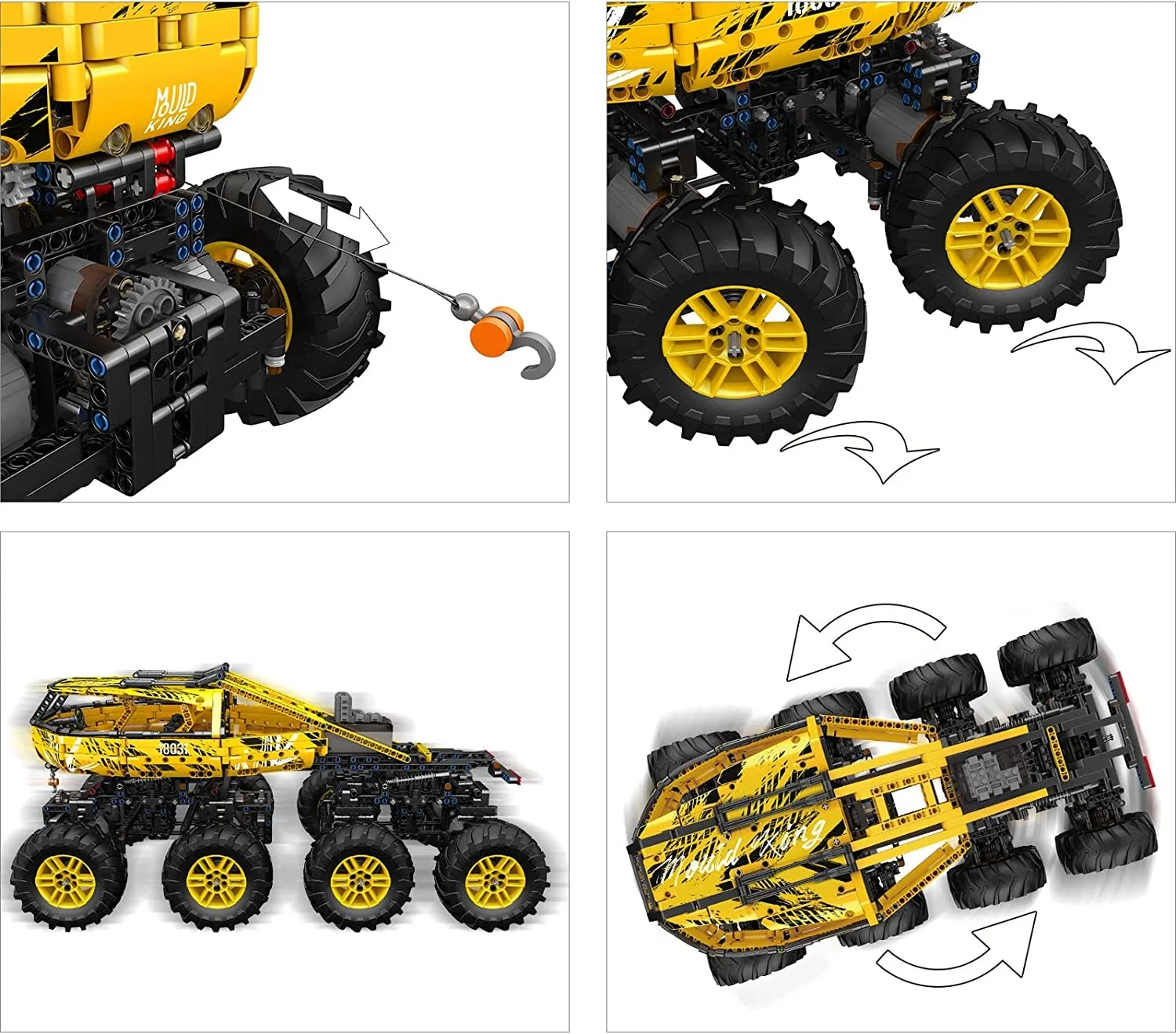 Neue Version 19004S. Das Flugfeldlöschfahrzeug von Mould King ist ein wirklich mächtiges Set, mit ebenso großem Spielwert. Mit einer Länge von über einem Meter und bestehend aus mehr als 6600 Teilen kommt das Modell auf ein Gewicht von gut 8kg. Das Design orientiert sich dabei an einem Rosenbauer Simba 8x8 oder einem Magirus Super Dragon x8. Von insgesamt 13 Motoren angetrieben fährt er zielsicher zum nächsten Einsatz. Auch der Löscharm und sogar der Neigungswinkel der Löschspritze lassen sich ferngesteuert einstellen. Dazu lässt sich zwischen der Wasserspritze am Löscharm und der am der Vorderseite des Fahrzeugs umstellen, sodass jedes Feuer effektiv bekämpft werden kann. Das Wasser wird pneumatisch aus den acht Wassertanks zu den Löschspritzen gepumpt. Tipp: Das Befallen der Wassertanks mit der mitgelieferten Pipette dauert sehr lang. Hier empfiehlt sich eine 10ml Spritze mit stumpfer Kanüle für wenige Rappen aus der Apotheke.