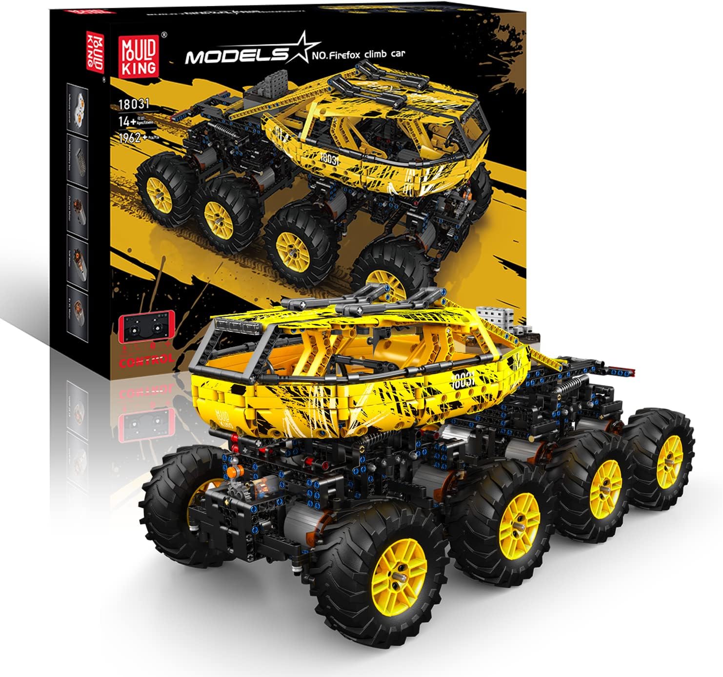 Das Mould King Firefox Climb Car, lizensiertes Modell vom MOC-Designer ZeroBricks, vielen Bekannt durch das Monster Modell 13061. Im Gegensatz zum G700 ist dies jedoch ein Technic-Modell für Einsteiger. Nicht weniger als 8 XL-Motoren sorgen für Vortrieb, 2 x Servo- und ein M-Motor (Seilwinde) sind für die weitern Funktionen zuständig. Als Power- und Steuerungsmodul kommt das proportional arbeitende Powermodule V6 (7.4 V, 600mA) zum Einsatz (einzeln als M-0019 zu beziehen).