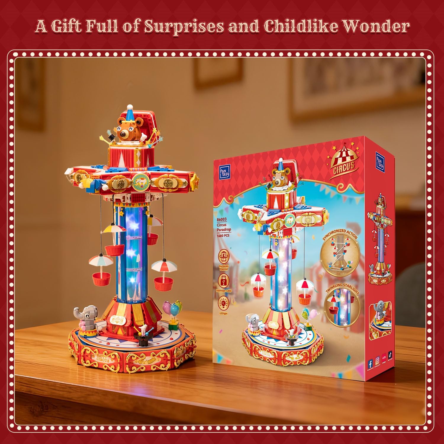 Inspiriert von klassischen Wanderzirkussen bietet dieses detailreiche Klemmbaustein-Set einen überraschenden Magic-Box-Teddybären, Clownhüte, Spielkarten, Schleifen und sternförmige Ornamente. Es verbindet kindliche Fantasie, Vintage-Charme und hohen Display-Wert – ein echter Blickfang.