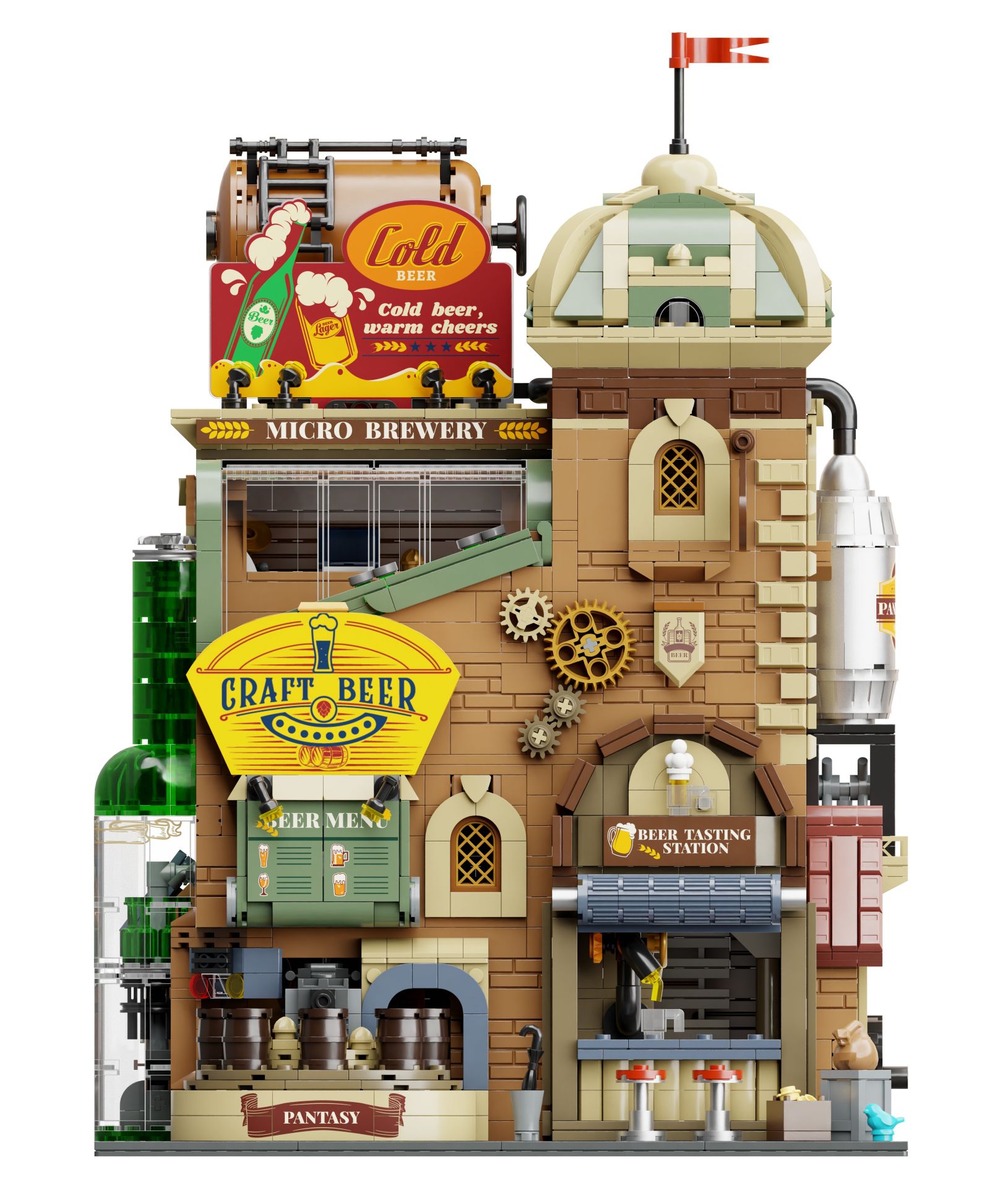 Herzlich willkommen in deiner eigenen kleinen Brauerei! Dieses detailverliebte Klemmbaustein-Set lässt dich in die Welt des Bierbrauens eintauchen. Schon von außen versprüht die Craft-Brauerei nostalgischen Charme: Zahnräder und Rohre zieren die Backsteinfassade, ein großes Schild mit der Aufschrift "Craft Beer" lädt durstige Gäste ein und auf dem Dach thront ein alter Wassertank neben einer kupferfarbenen Braukessel-Kuppel. Man fühlt sich direkt wie vor einer echten Brauerei in einer malerischen Altstadt – nur eben im Miniaturformat.