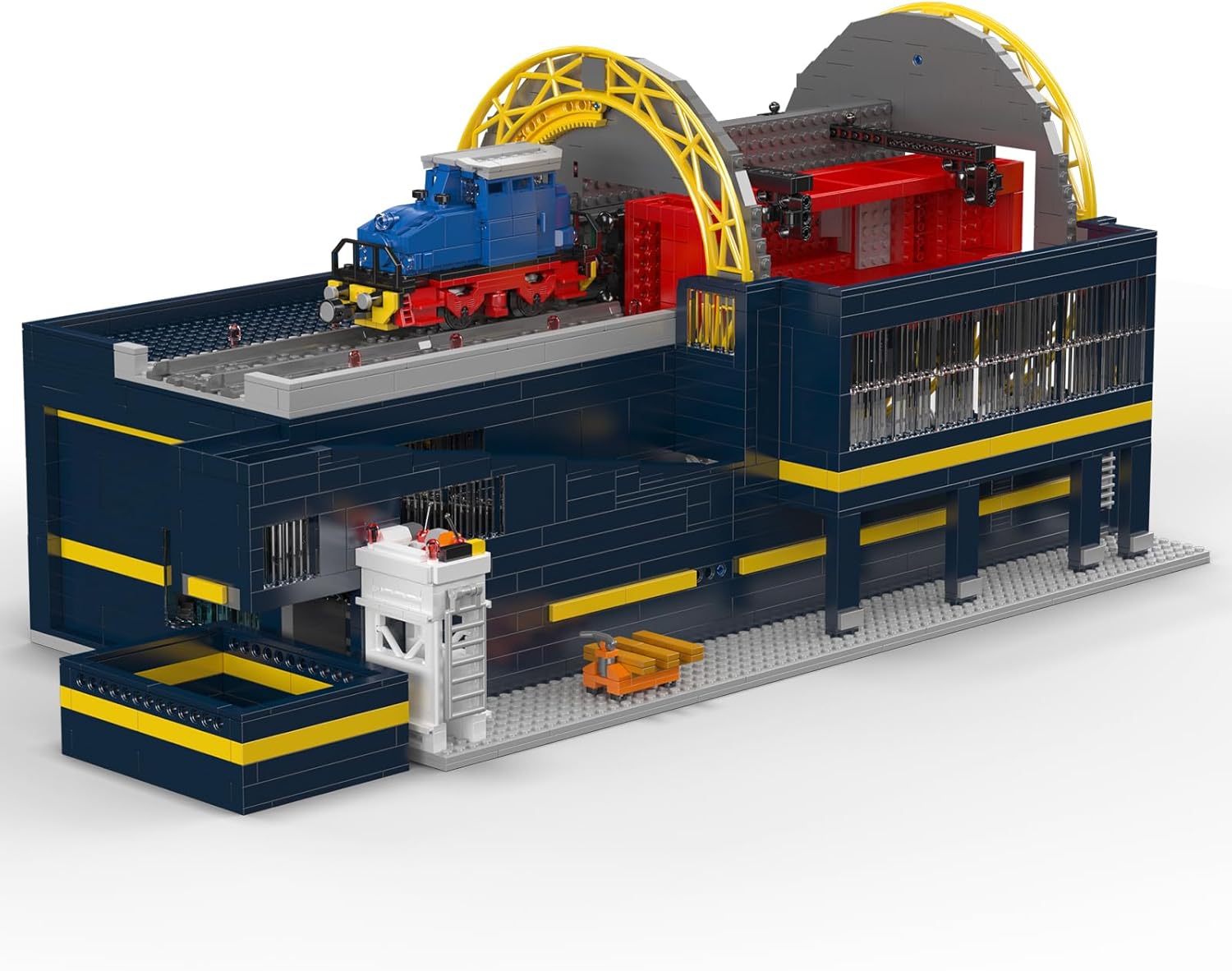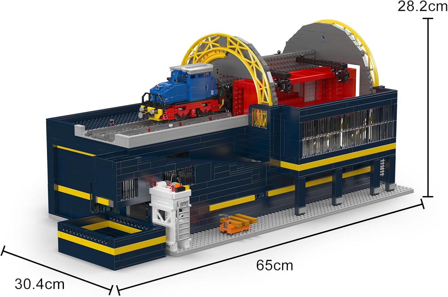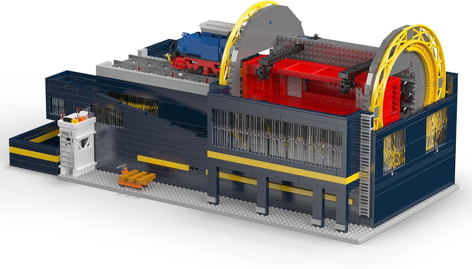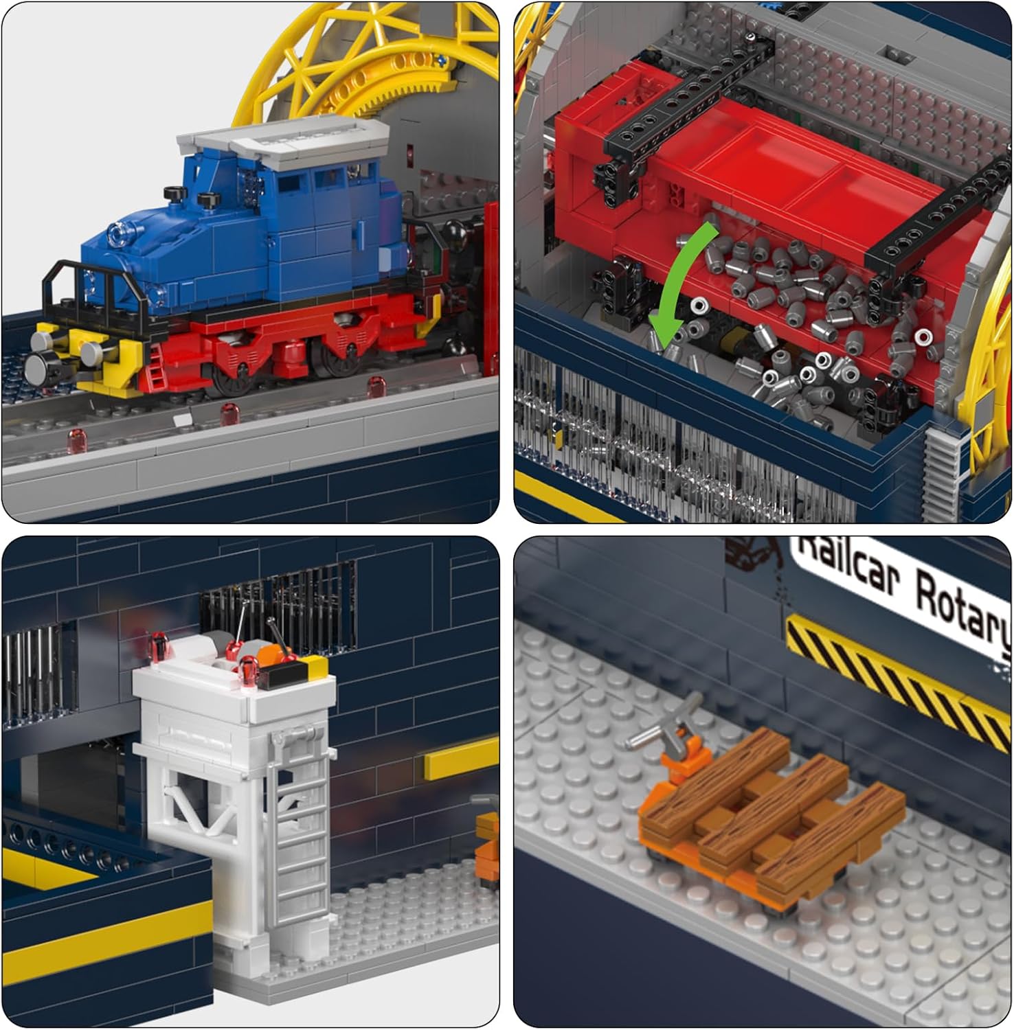 Das Modell basiert auf einem echten Drehkippmechanismus. Ein gelber, bogenförmiger Rahmen und verstärkte graue Stützwände fixieren den Eisenbahnwaggon und führen eine vollständige Drehbewegung beim Entladen.