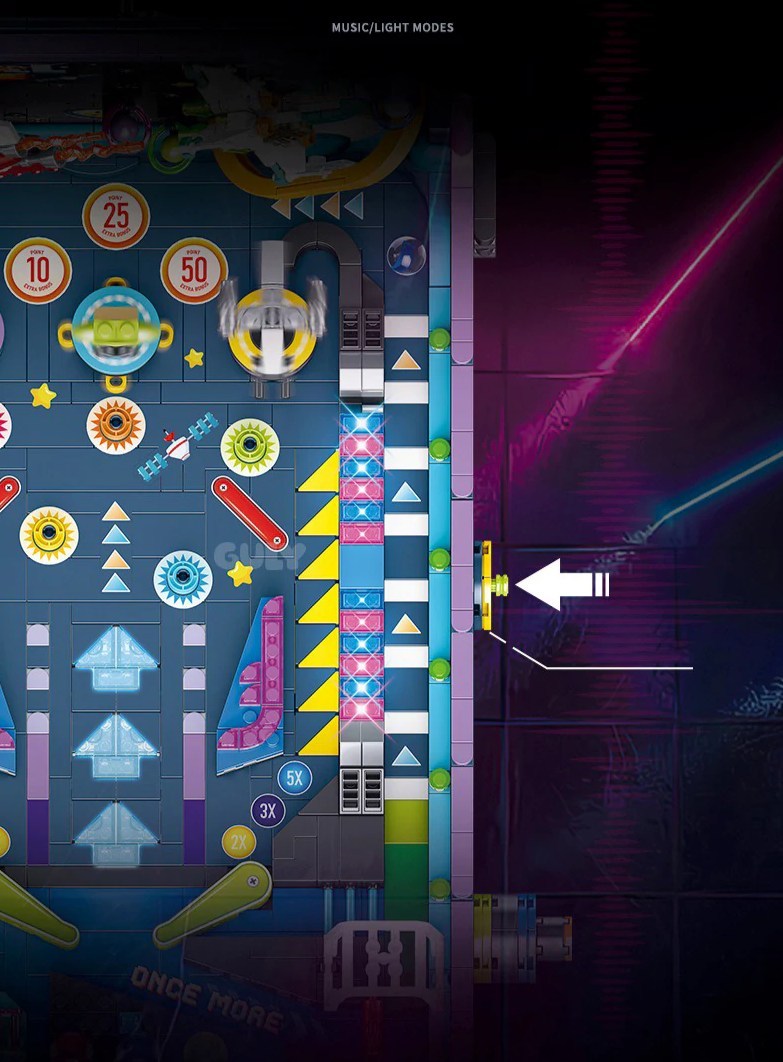Mit einem voll funktionsfähigen Flipper mit motorisierten Funktionen und interaktiven Lichtern. Das Set enthält einen M-Motor, Soundmodule, LED-Lichter und eine Batteriebox.