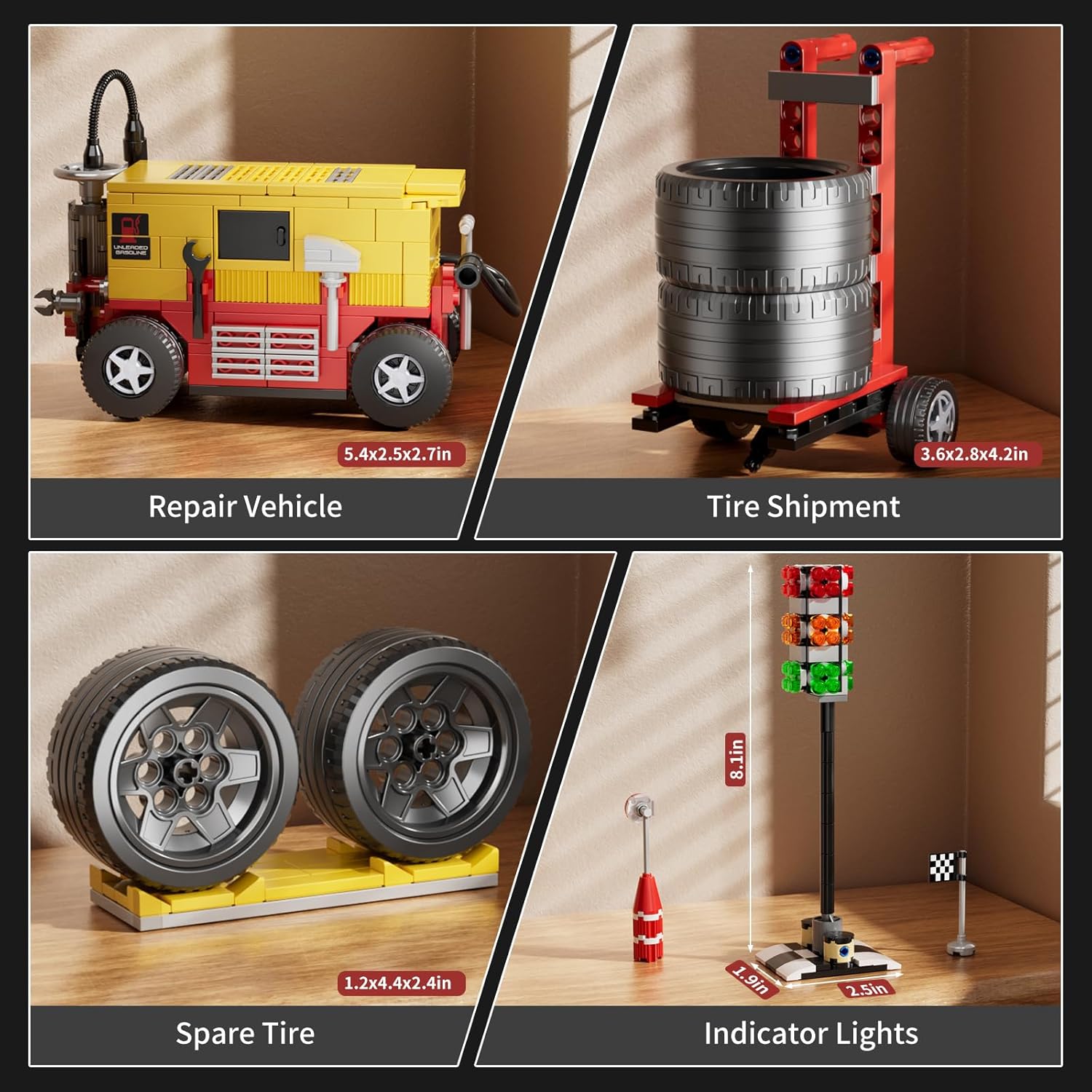 Was wäre ein Rennwagen ohne die passende Umgebung? Mould King hat an alles gedacht: Von Ampeln, über Rennfahnen bis hin zu Service-Modul und Reifenwechsel-Sets