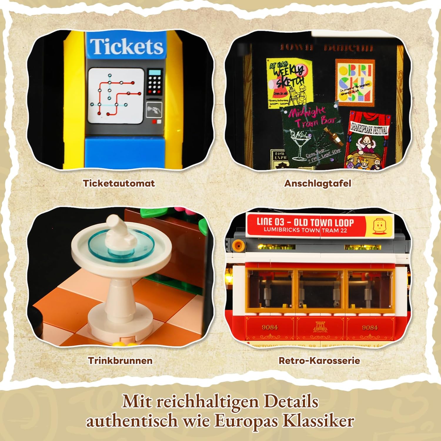 Dieses Set entführt dich mitten hinein in die Atmosphäre einer alten europäischen Altstadt. Vor dir rollt eine nostalgische Straßenbahn an einem kleinen Kopfbahnhof ein – tagsüber ein gemütlicher Nahverkehrsklassiker, nachts verwandelt sie sich in eine charmante Bar auf Schienen. Warmes Licht flackert aus den Fenstern, Straßenmusiker stimmen ihre Lieder an, während Passanten die Szene mit Leben füllen. Es ist ein Diorama, das nicht nur gebaut, sondern regelrecht erlebt wird: ein Stück städtische Romantik zwischen Alltag und Abendglanz.
