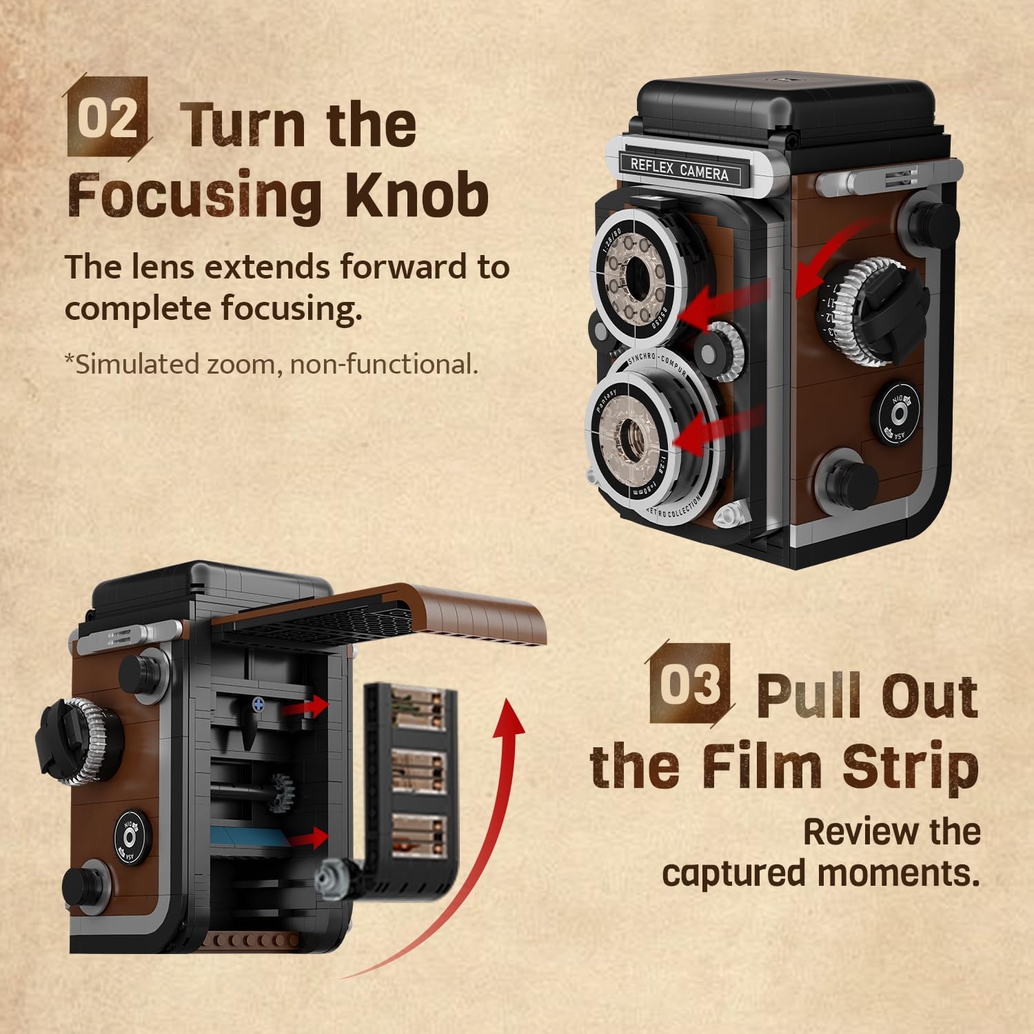 Der Aufbau überzeugt durch die gewohnt hohe Präzision der GoBricks-Steine. Besonderes Augenmerk liegt auf der mechanischen Finesse: Der Lichtschachtsucher lässt sich authentisch aufklappen, während die seitliche Kurbel und die Fokus-Räder das haptische Erlebnis einer echten Kamera nachempfinden. Die glatten Oberflächen und metallischen Akzente sorgen für ein Finish, das kaum noch an einen Bausatz erinnert.