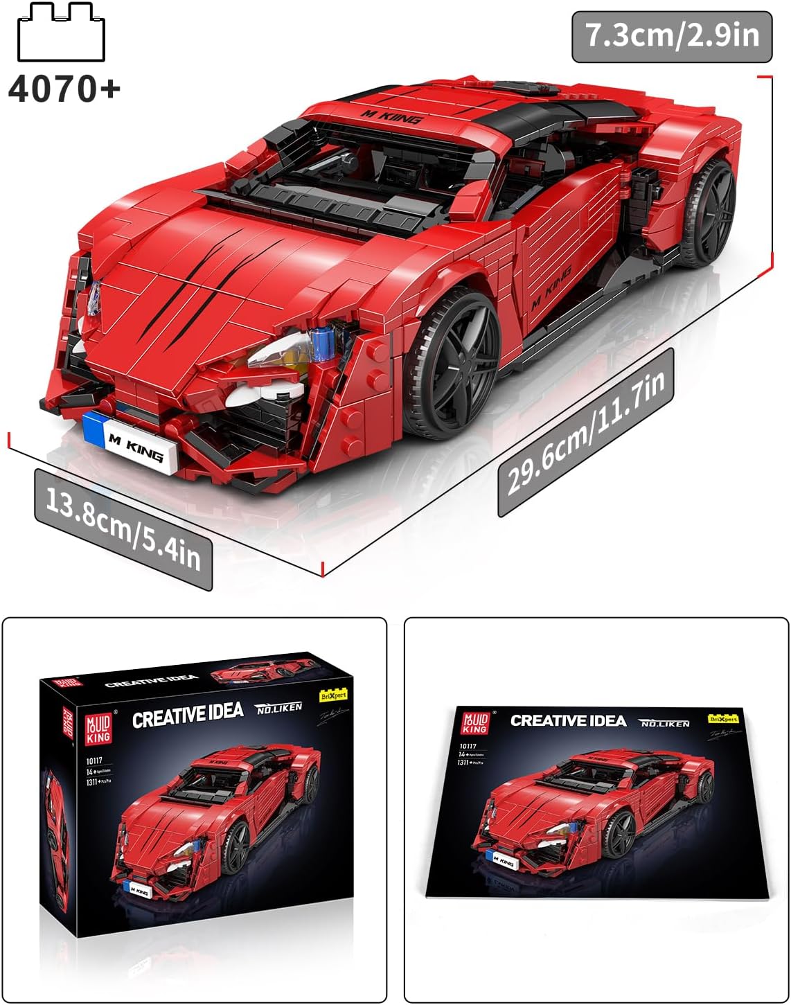 Formschönes, dem realen Vorbild sehr gut nachgebildetes Modell eines italienischen Super-Sportwagens mit dem schönen Namen AS-Valkyrie. Unter der Creativ Idea-Reihe von Mould King versteckt sich ein wahrer Fundus an gelungenen Sportwagen und Oldtimer-Modellen fürs Regal oder die Vitrine. Hier sorgte sogar der bekannte MOC-Designer Firas Abu-Jaber dafür, dass dieses Modell seinem realen Vorbild besonders ähnlich sieht. Flügel-Türen, die Motorhaube und der Kofferraum lassen sich öffnen. Die besondere Farbe, sowie die stylischen Felgen runden das Gesamtangebot ab. Die Steine sind nach Bauabschnitten in Tüten vorsortiert und die Anleitung leicht verständlich, so dass einem entspannten Bauspaß nichts mehr im Wege steht. Dieses Modell ist ein Muss für jeden Sportwagen-Fan! Sehr gute Qualität der Bausteine.100% kompatibel mit den Klemmbausteinen des Marktführers.Gut verständliche Bauanleitung beiliegend.