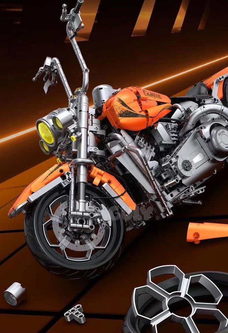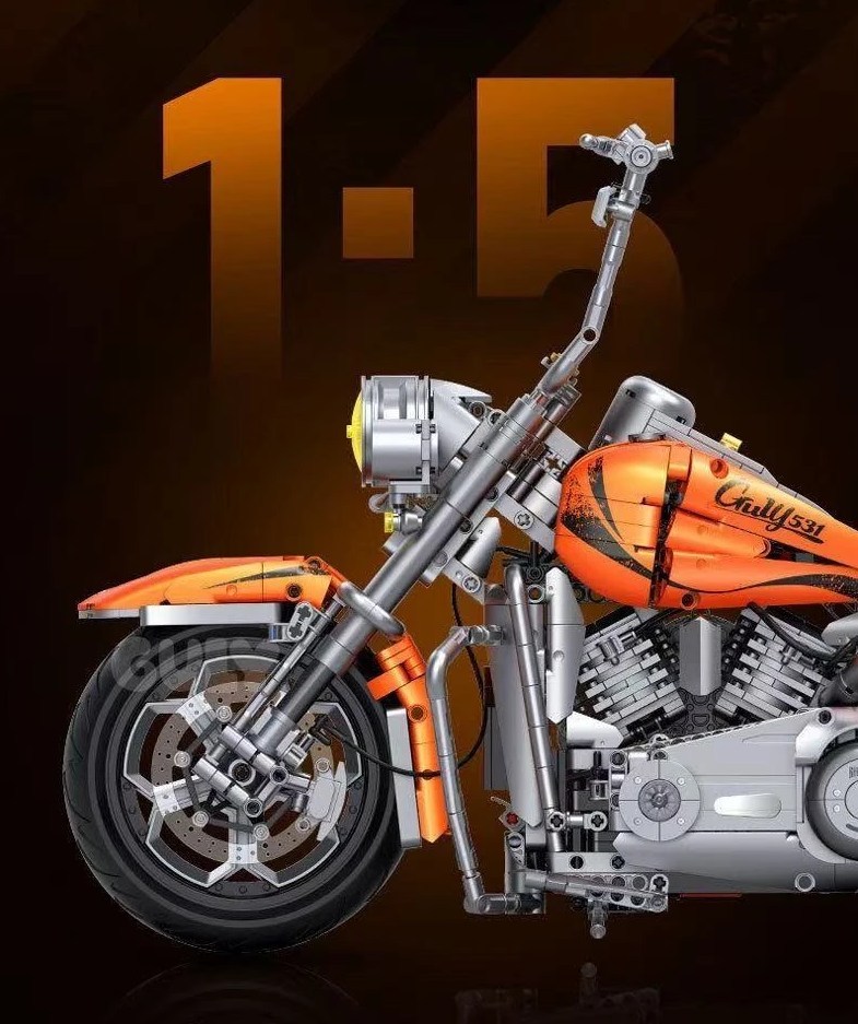 Die GULY Orange Chopper ist ein Technic-Modell im Maßstab 1:5, das die Essenz einer echten Harley einfängt. Mit seinem charakteristischen V2 und dem klassischen Profil liefert dieses Motorrad pure Freiheit in jedem Stein.