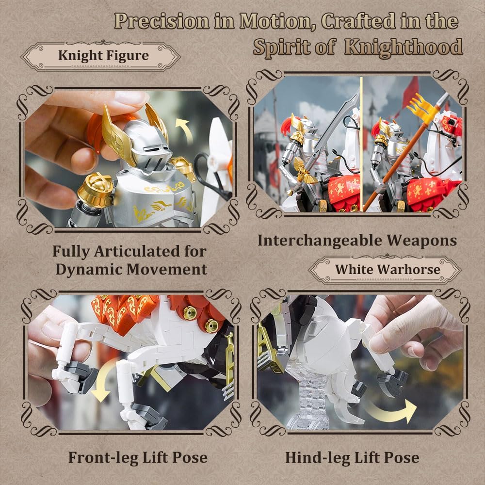 Statt Minifiguren und Spielfunktionen erwartet den Bauer eine imposante Sammlerstatue aus 905 Teilen. Besonders eindrucksvoll sind die metallisch glänzenden Gold- und Silberdetails an Rüstung und Pferdegeschirr, die dem Modell eine edle Wirkung verleihen. Bedruckte Ornamente auf Pferd und Sockel ersetzen Aufkleber und sorgen für langlebige, detailverliebte Gestaltung. Pantasy hat sogar eigens geformte Teile für Helm, Schild und Ausrüstung entwickelt.
