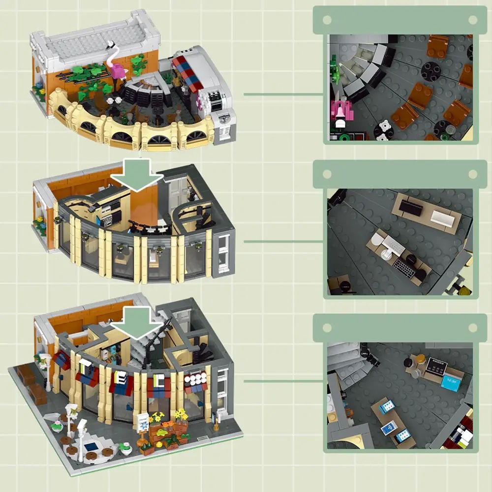 The Office aus der Feder des bekannten MOC-Designer ohsojang ist erfrischender weise mal weder Einzelhandel noch Gastronomie, sondern ein Bürogebäude. Allein dafür kann sich der Kauf schon lohnen. Darüber hinaus bietet es ein schickes, modernen Designs, dazu eine witzige Modularität und großartige Funktionen. Keine Aufkleber, 50 bedruckte Teile PanBo ist ein neuer Markenname, aber inhaltlich identisch zu Mork. Neue Version mit Steinen der Marke GoBricks.