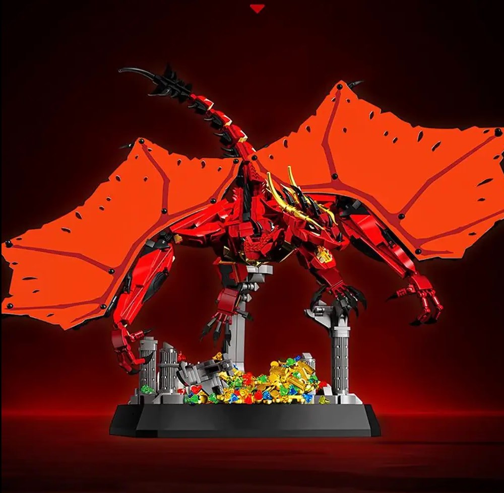 Zusätzlich sind fast 200 goldfarbene Teile und transparente Diamant-Steine enthalten, um einen atemberaubenden Schatzhort zu schaffen, der um die Basis verstreut ist und die Ästhetik der Drachenhöhle perfekt einfängt. Insbesondere wenn er von dem versteckten roten Lichtstein beleuchtet wird.