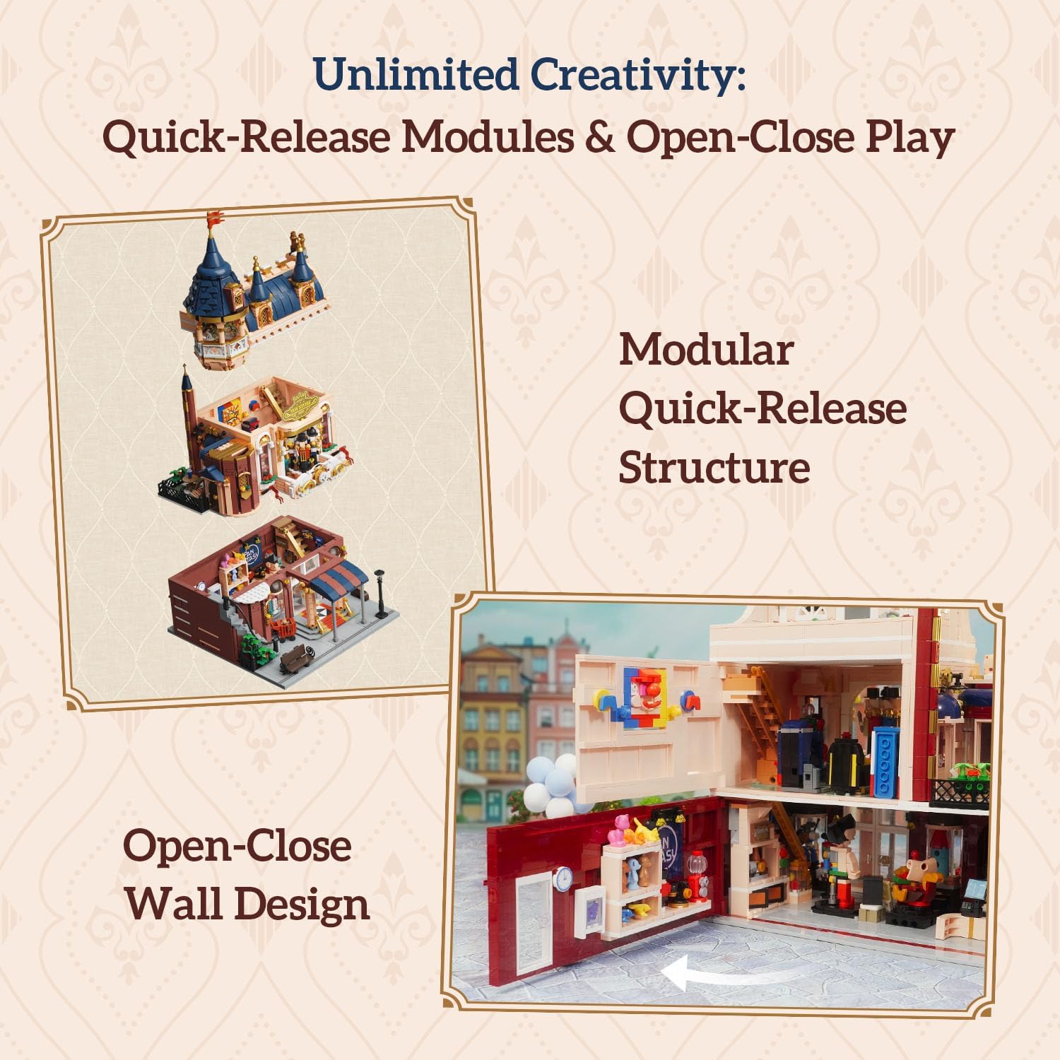 Der Spielzeugladen von Pantasy vereint märchenhaften Architektur-Charme mit detailreicher Spielfreude. In einem dreistöckigen Stadthaus im europäischen Stil entfaltet sich eine nostalgische Atmosphäre, die Erinnerungen an Weihnachtsmärkte, Kinderträume und die Magie alter Spielzeuggeschäfte weckt. Die creme-rote Fassade wird von einer imposanten Nussknacker-Gruppe geschmückt, die sich über ein Zahnrad in Bewegung setzen lässt – ein Highlight, das dem Modell ein einzigartiges Schaufenster-Flair verleiht. Schon beim ersten Anblick entsteht ein Gefühl von festlicher Vorfreude und lebendigem Straßenszenario, das Jung und Alt gleichermaßen begeistert.