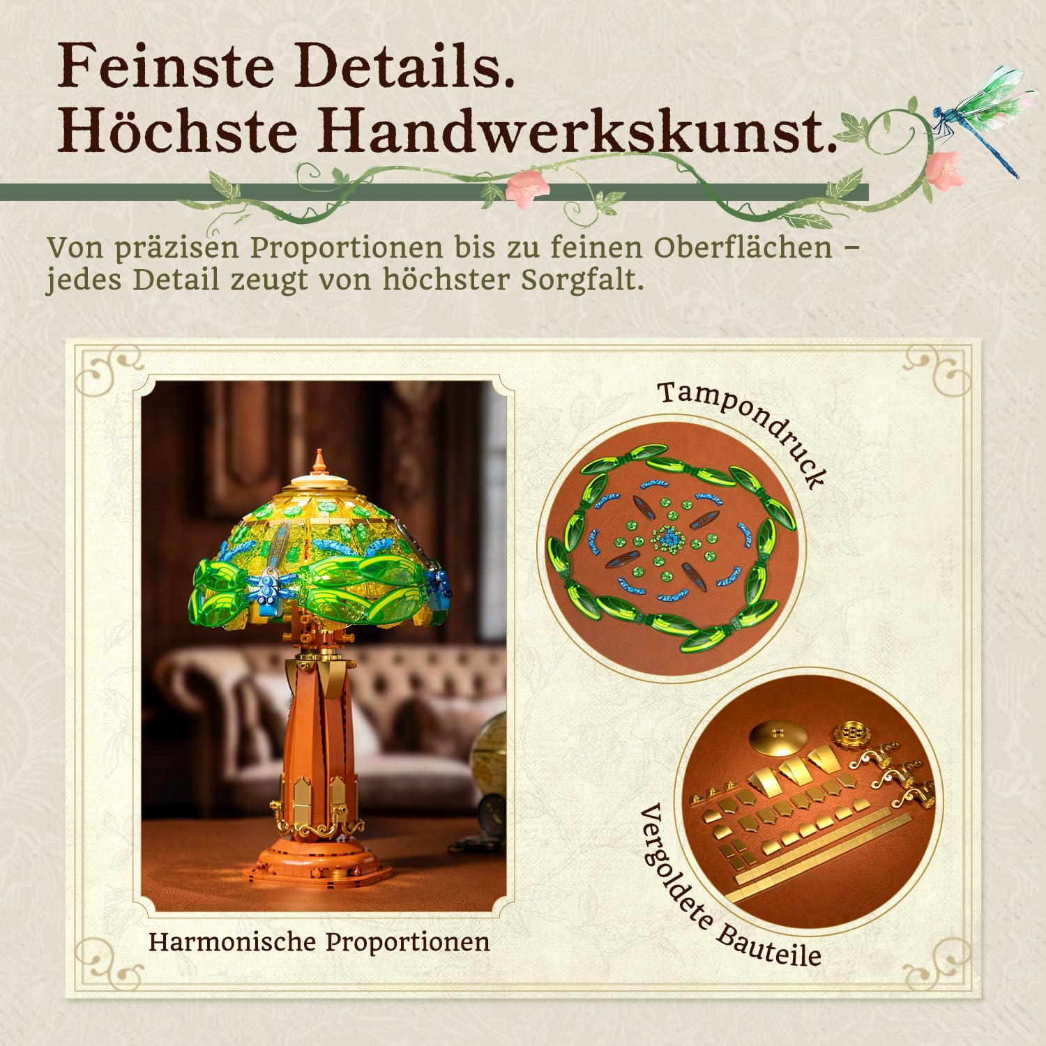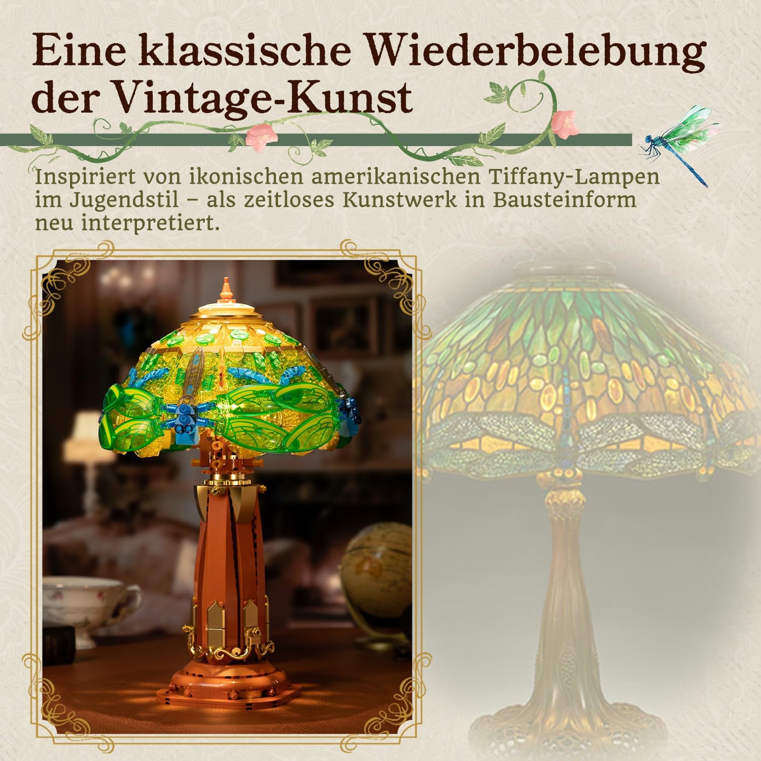 Inspiriert von klassischen Buntglaslampen entsteht das Libellen- und Blumenmotiv Schicht für Schicht aus farbigen, transparenten Bausteinen. Im eingeschalteten Zustand entfalten sich lebendige Farben und ein sanfter Lichtfluss – ein echtes Retro-Kunstobjekt statt einer gewöhnlichen Nachtlampe.