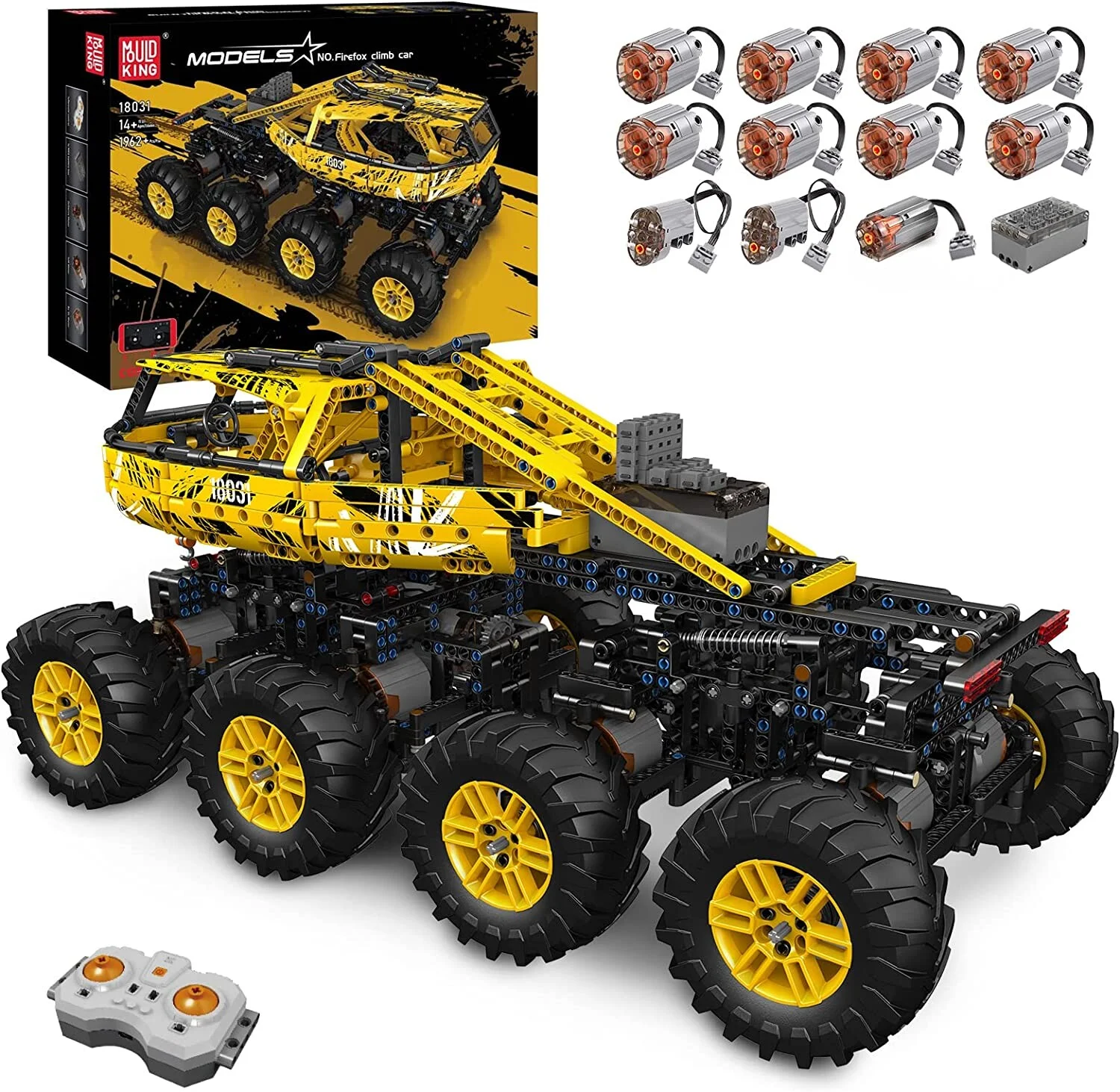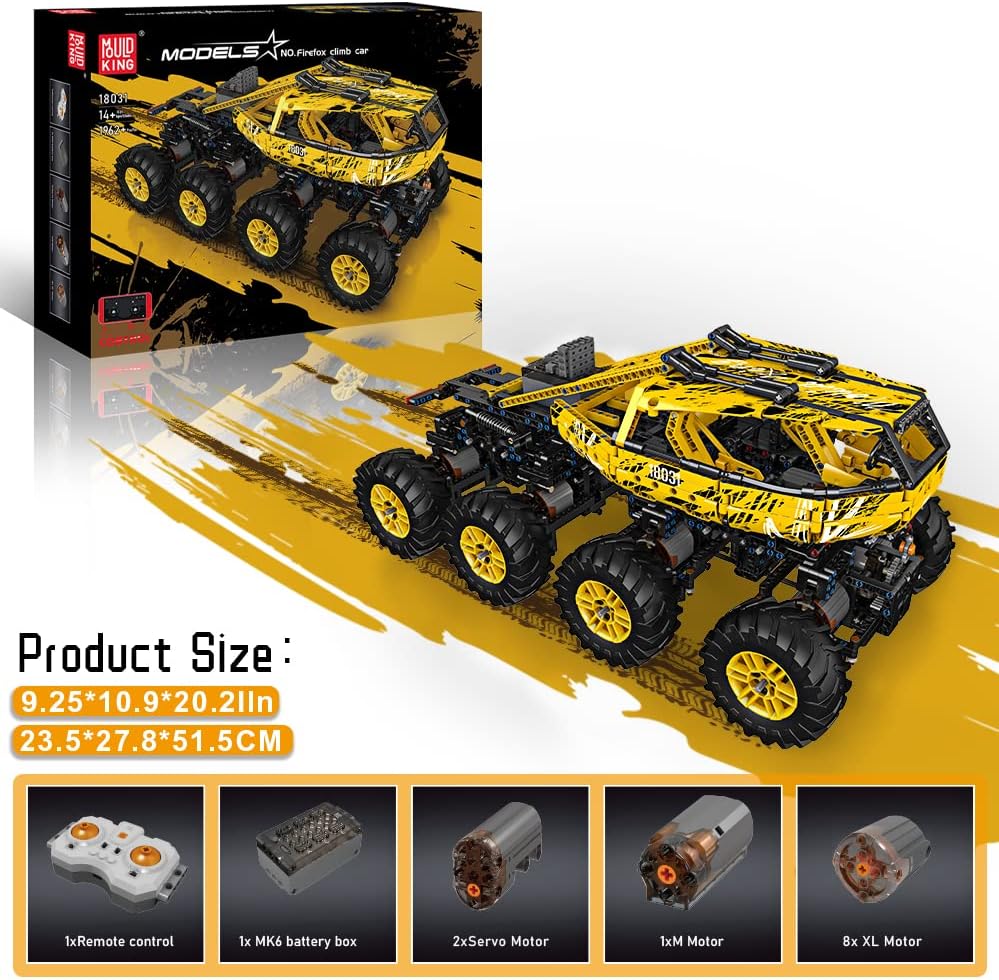 Das Mould King Firefox Climb Car, lizensiertes Modell vom MOC-Designer ZeroBricks, vielen Bekannt durch das Monster Modell 13061. Im Gegensatz zum G700 ist dies jedoch ein Technic-Modell für Einsteiger. Nicht weniger als 8 XL-Motoren sorgen für Vortrieb, 2 x Servo- und ein M-Motor (Seilwinde) sind für die weitern Funktionen zuständig. Als Power- und Steuerungsmodul kommt das proportional arbeitende Powermodule V6 (7.4 V, 600mA) zum Einsatz (einzeln als M-0019 zu beziehen).