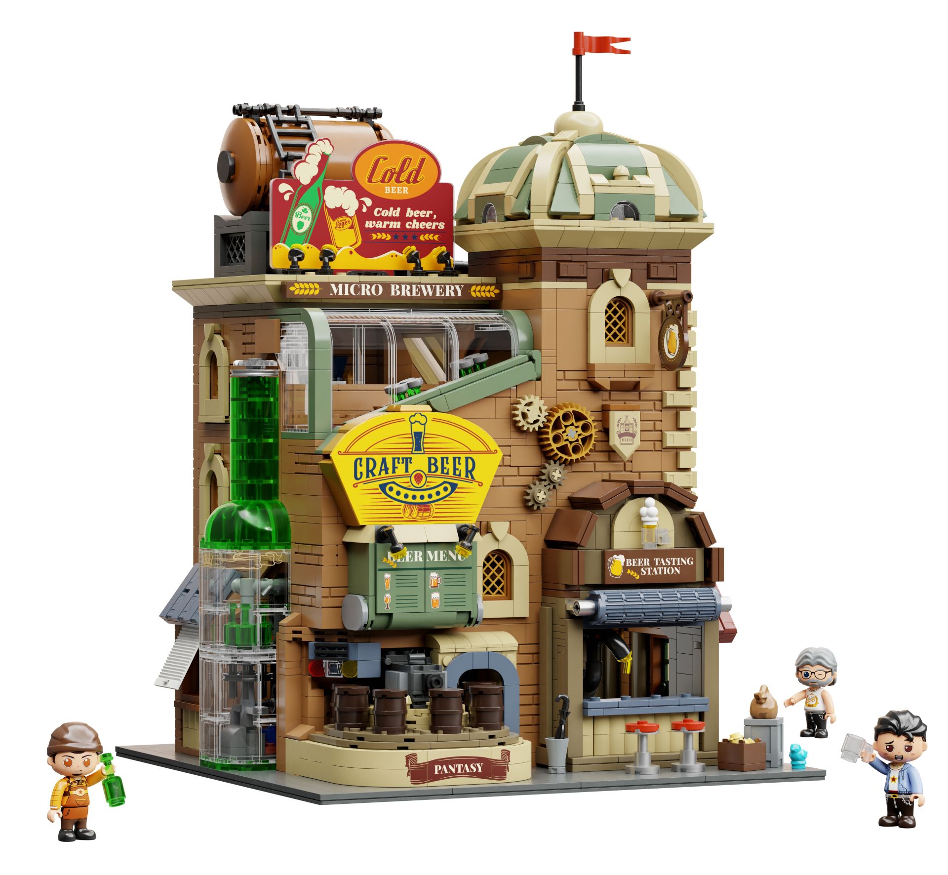 Die Craft-Brauerei überzeugt nicht nur durch ihre vielen Details, sondern auch durch einen durchdachten modularen Aufbau. Die Rückwand des Gebäudes lässt sich öffnen und jedes Stockwerk ist abnehmbar, sodass du mühelos in alle Räume schauen und spielen kannst. Mit ca. 25 x 25 cm Grundfläche passt die Brauerei perfekt zu anderen modularen Straßensets und erweitert deine Stadt um einen einzigartigen Treffpunkt. Drei enthaltene Figuren – der Braumeister, der Brauerei-Besitzer und ein bierbegeisterter Gast – erwecken das Szenario zum Leben.