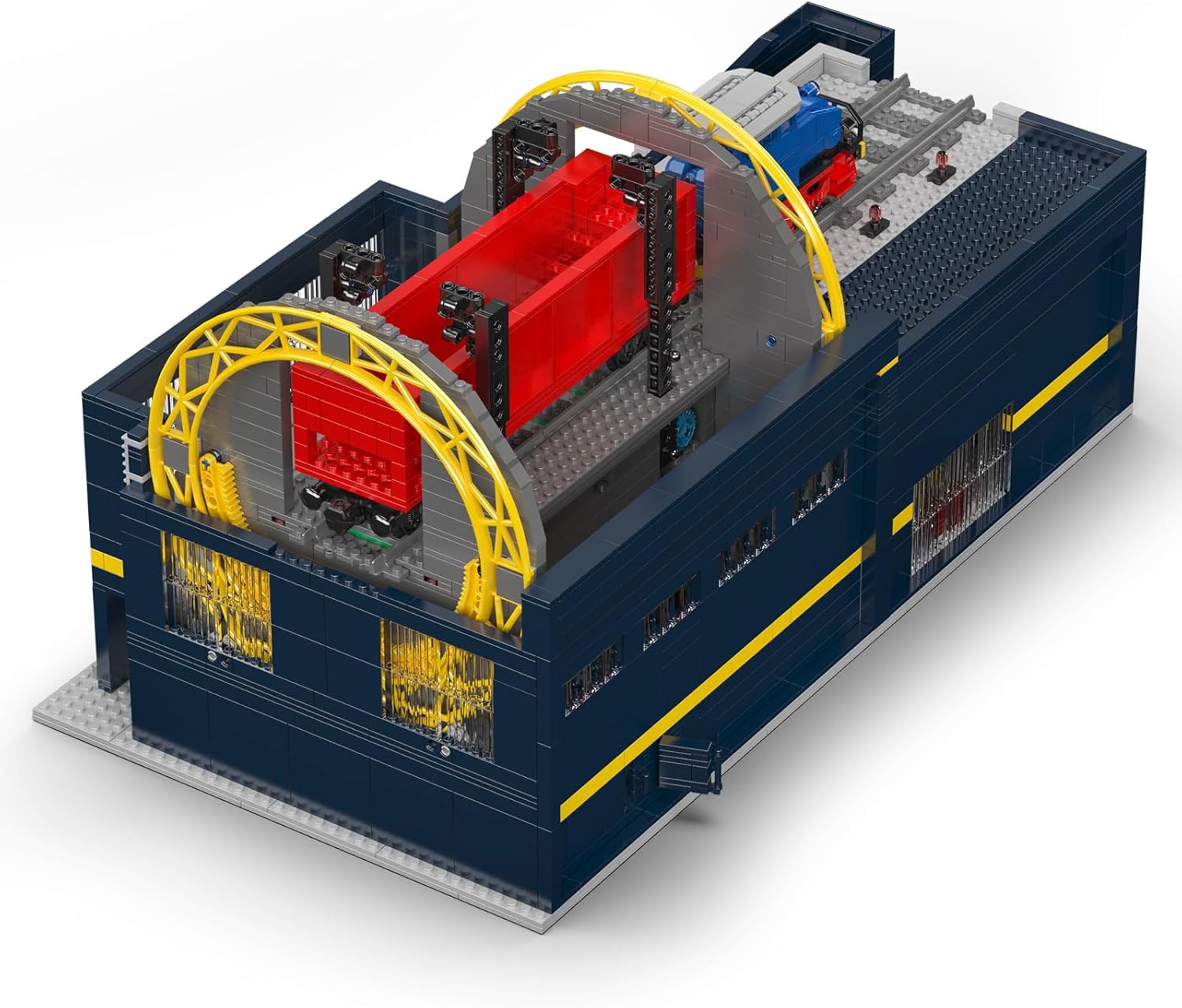 Das Modell basiert auf einem echten Drehkippmechanismus. Ein gelber, bogenförmiger Rahmen und verstärkte graue Stützwände fixieren den Eisenbahnwaggon und führen eine vollständige Drehbewegung beim Entladen.