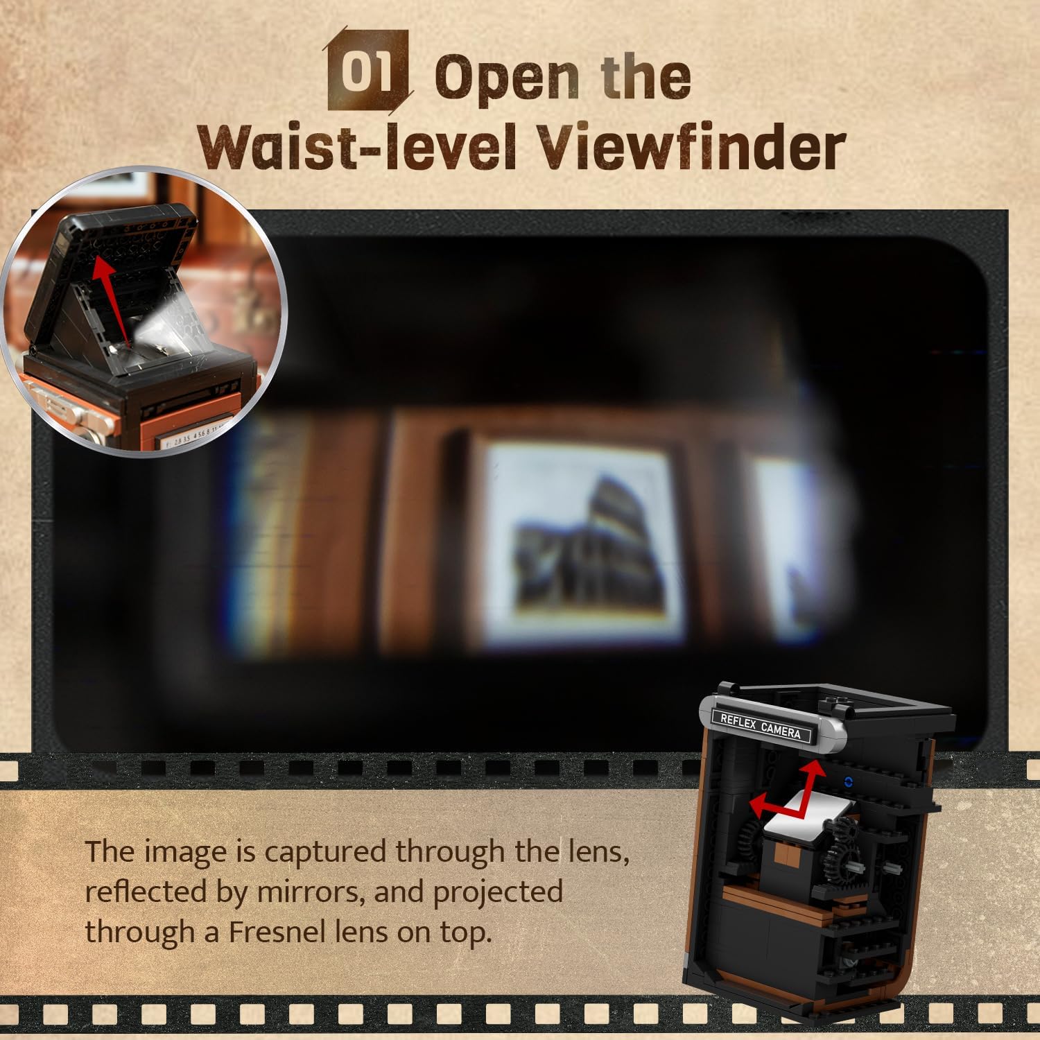 Der Aufbau überzeugt durch die gewohnt hohe Präzision der GoBricks-Steine. Besonderes Augenmerk liegt auf der mechanischen Finesse: Der Lichtschachtsucher lässt sich authentisch aufklappen, während die seitliche Kurbel und die Fokus-Räder das haptische Erlebnis einer echten Kamera nachempfinden. Die glatten Oberflächen und metallischen Akzente sorgen für ein Finish, das kaum noch an einen Bausatz erinnert.