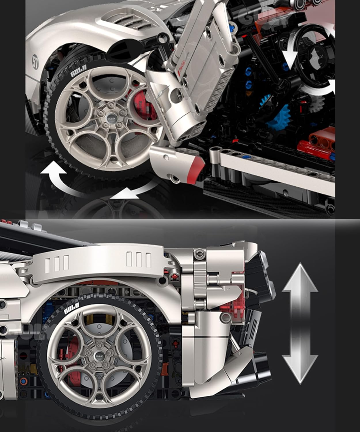 Lizensiert von Audi! Der Audi R8 LMS GT3 von Rastar ist eine wirklich willkommene Wohltat fürs Auge. Obwohl Rastar bei dem Audi auf ein Getriebe verzichtet hat, bietet der Wagen im Maßstab 1:8 einige interessante Aspekte. So ist der Wagen optisch recht nah am original, was nicht zuletzt durch den geschickten Einsatz von Systembausteinen an den richtigen Stellen erreicht wurde. Die PowerFunctions können im Fahrzeug so verbaut werden, dass keine offen liegenden Kabel die Optik auch im Innenbereich stören. Des Weiteren hat Rastar versucht, durch den geschickten Einsatz von entsprechend farbigen Pins die typische Farbseuche zu vermeiden. Aufgebaut ist der Audi R8 LMS GT3 gut 56cm Lang und 27cm Breit. Türen und die mit Stoßdämpfern versehene Heckklappe lassen sich öffnen. RC Version mit Power Functions und LED.