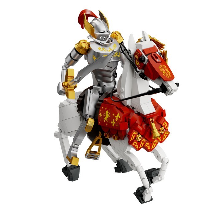 Statt Minifiguren und Spielfunktionen erwartet den Bauer eine imposante Sammlerstatue aus 905 Teilen. Besonders eindrucksvoll sind die metallisch glänzenden Gold- und Silberdetails an Rüstung und Pferdegeschirr, die dem Modell eine edle Wirkung verleihen. Bedruckte Ornamente auf Pferd und Sockel ersetzen Aufkleber und sorgen für langlebige, detailverliebte Gestaltung. Pantasy hat sogar eigens geformte Teile für Helm, Schild und Ausrüstung entwickelt.