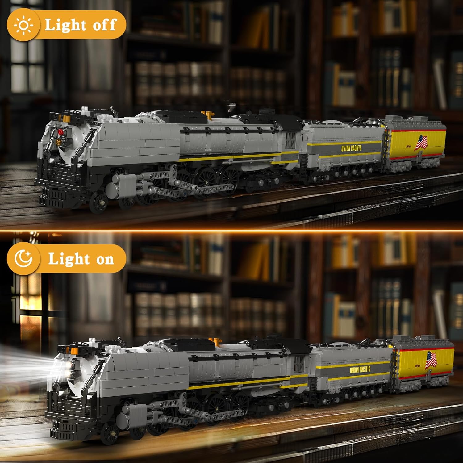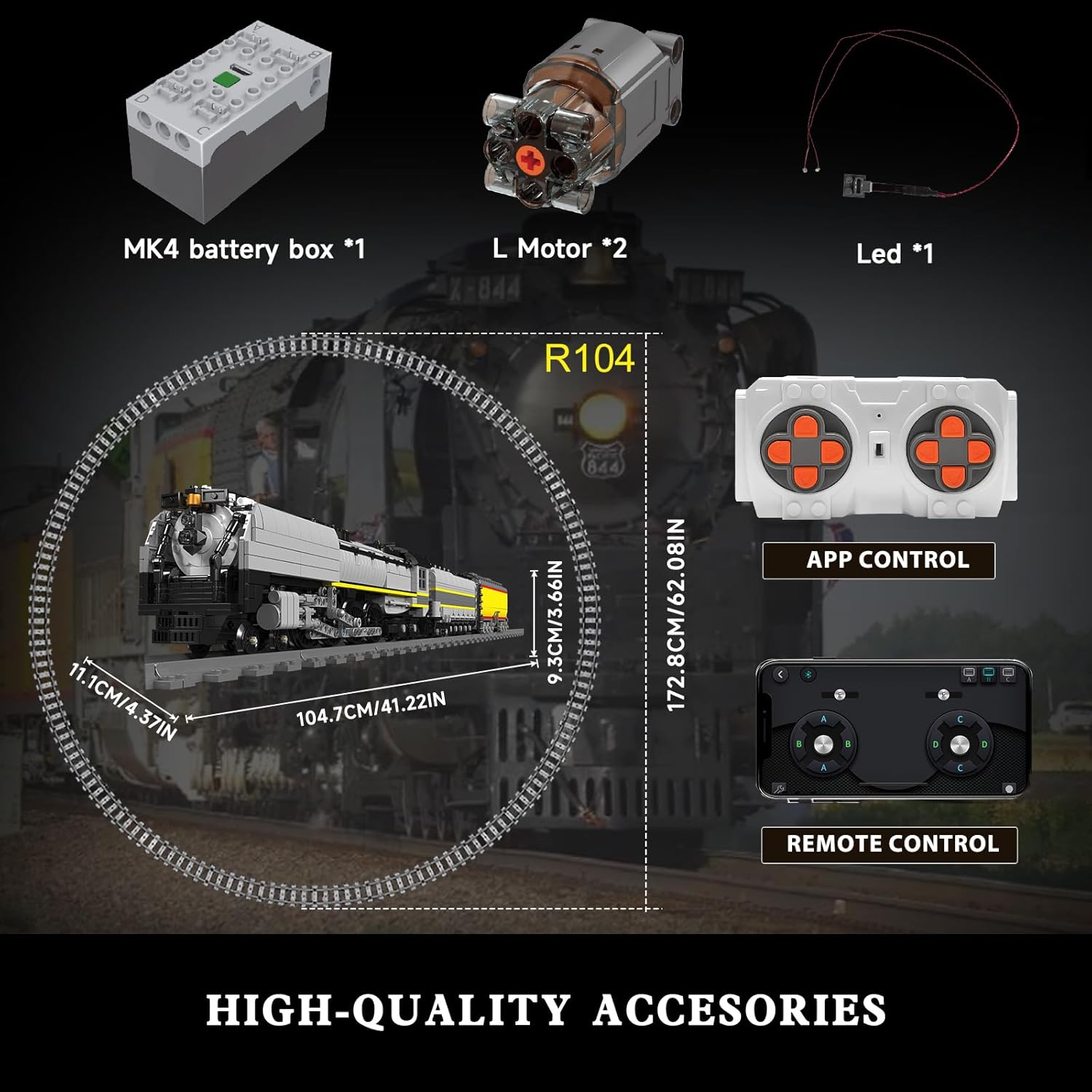 Formschönes und farblich ansprechendes Modell einer EMD SD40-2 Diesel Lokomotive, inklusive Verladekran und LKW. Dieses Set ist mit dem Mould King RWY-Modul motorisiert und wird über die beiliegende Fernbedienung gesteuert. Das RYW-Modul vereint Antrieb, Empfänger und Akku in einem Modul, dass an den Form-Faktor des Eisenbahn-Motor angelehnt ist (aber 1 Noppen breiter). Wie bei der World Railway Reihe von Mould King üblich gehört zum Set auch noch ein Schienen-Oval (120cm x 80cm). Dieses lässt sich in ein vorhandenes Schienen-Netz integrieren, da voll kompatibel mit den führenden Herstellern. Wie immer bei Mould King sind die Steine nach Bauabschnitten in Tüten vorsortiert und die Anleitung leicht verständlich.