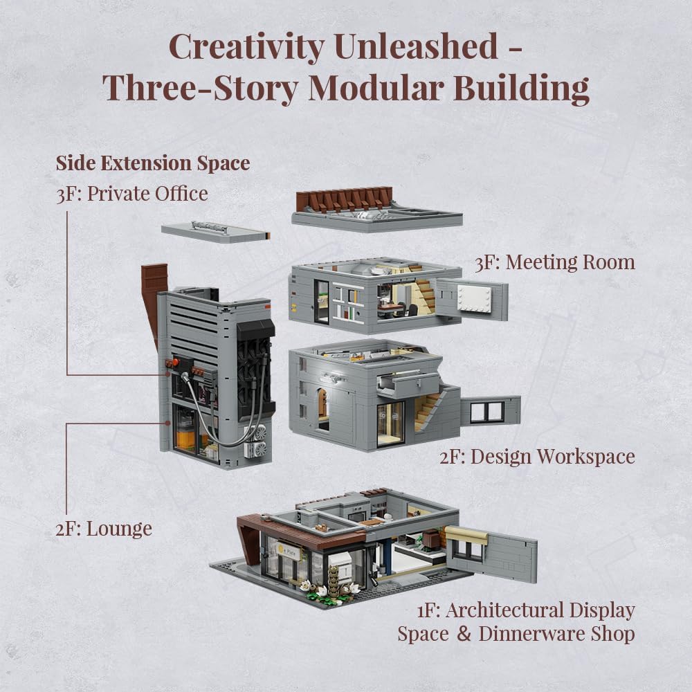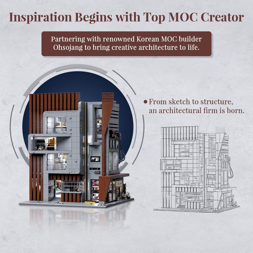 Modernes Stadtflair trifft auf architektonische Meisterklasse. In einer Welt aus Glas, Sichtbeton und warmen Holzelementen entsteht ein Ort der Kreativität. Das Architektur-Büro ist nicht nur ein Gebäude, sondern ein Statement für zeitgenössisches Design und urbanen Lifestyle. Die klare Formsprache und die Liebe zum Detail machen dieses Set zu einem absoluten Blickfang für jede moderne Klemmbaustein-Stadt.