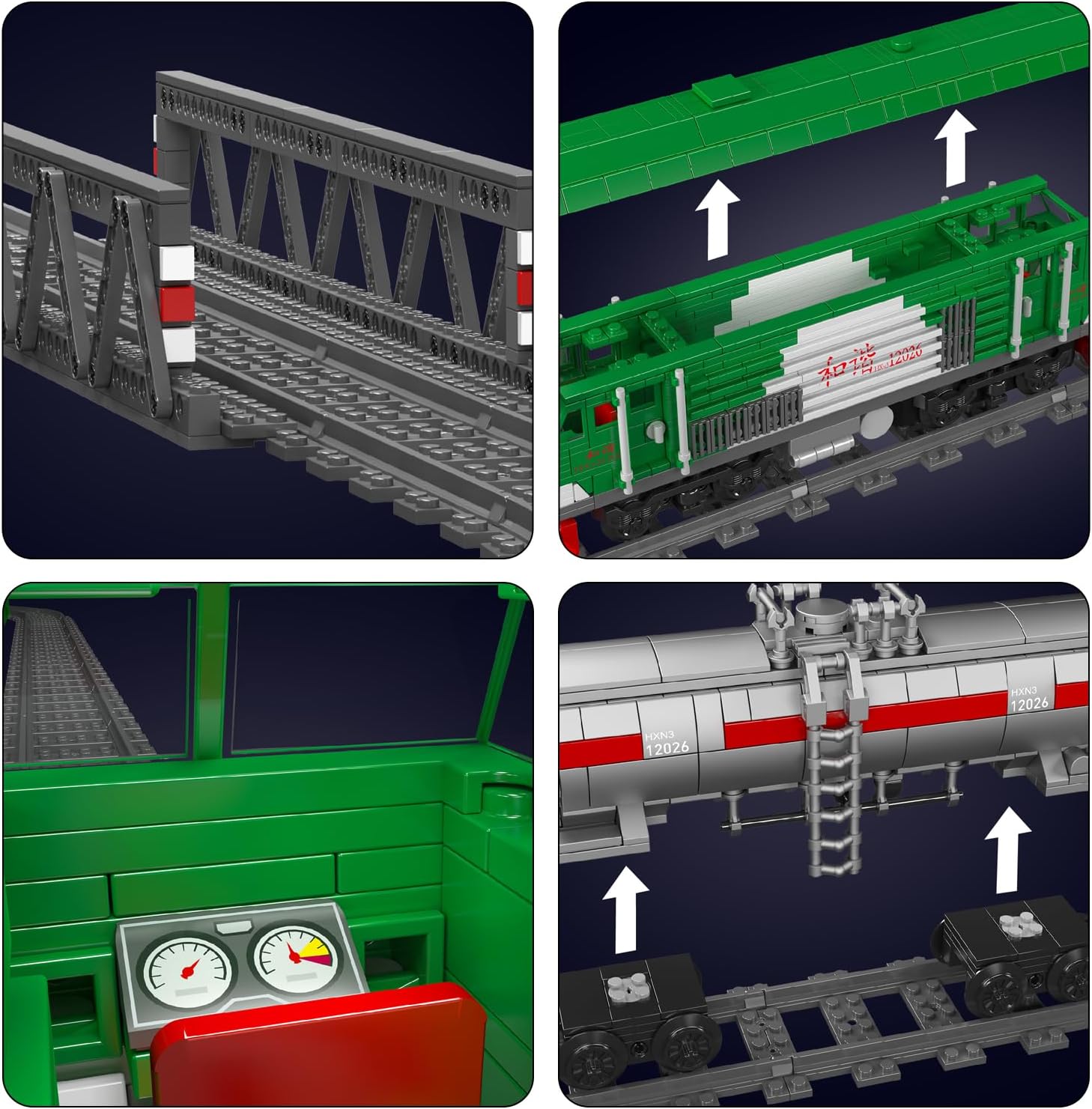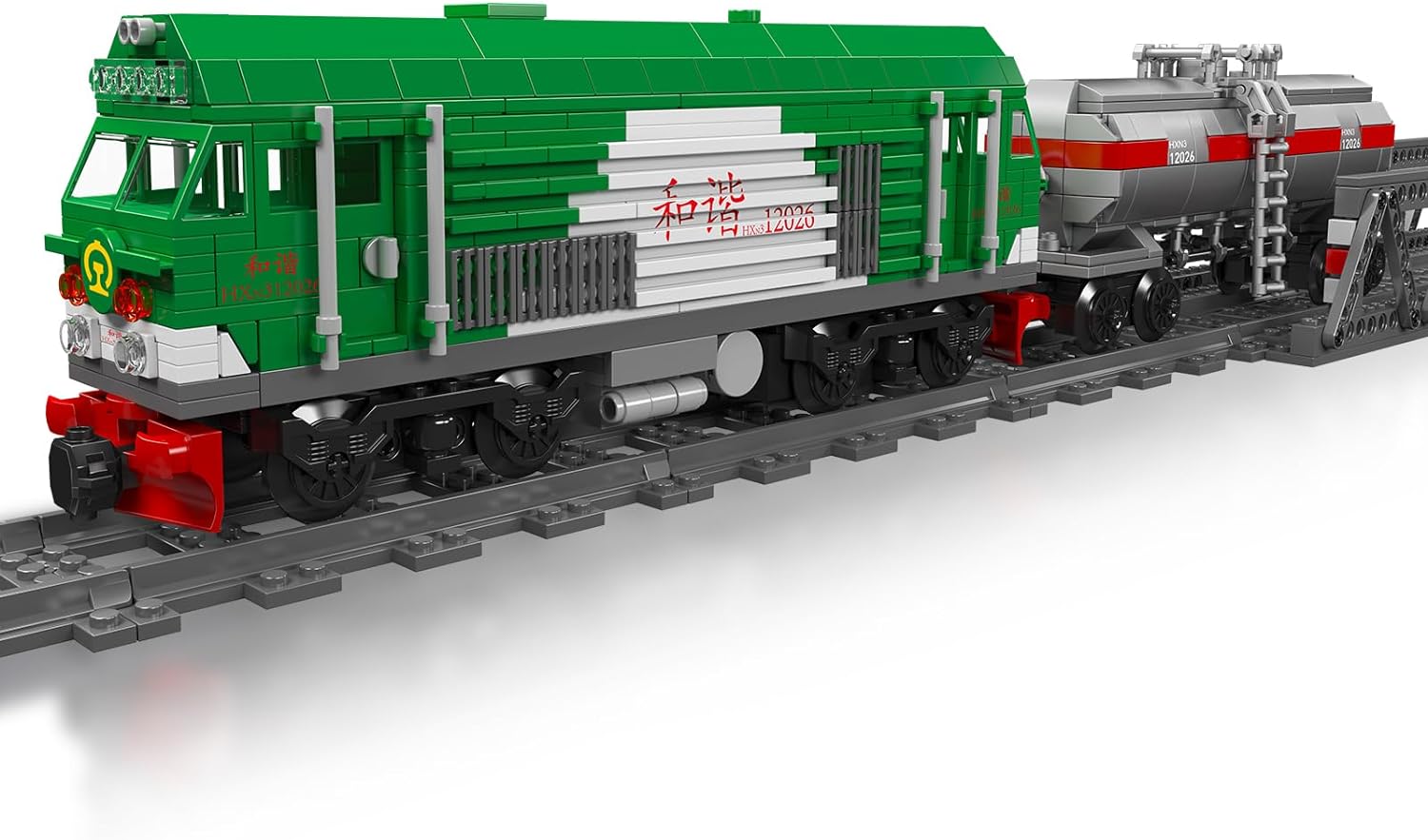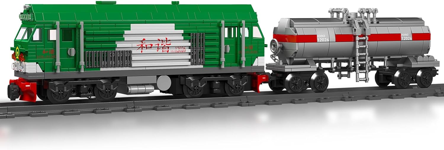 Formschönes und farblich ansprechendes Modell einer in China eingestzten Diesel-Elektro-Lok des Typs DF4B. Dank dem passenden Speisewagon mit Bordbistro und einem beschrankten Bahnübergang ergibt sich ein komplettes Eisenbahn-Spielset. Die Diesel-Elektro-Lok des Typs DF4B ist mit dem neuen Mould King RWY-Modul motorisiert und wird über die beiliegende Fernbedienung gesteuert. Das RYW-Modul vereint Antrieb, Empfänger und Akku in einem Modul, dass an den Form-Faktor des Eisenbahn-Motor angelehnt ist (aber 1 Noppen breiter). Wie bei der World Railway Reihe von Mould King üblich gehört zum Set auch noch ein Schienen-Oval (120cm x 80cm). Dieses lässt sich in ein vorhandenes Schienen-Netz integrieren, da voll kompatibel mit den führenden Herstellern. Bei dem Set handelt es sich um ein autorisiertes MOC des Eisenbahn-Spezialisten Marbleman Wie immer bei Mould King sind die Steine nach Bauabschnitten in Tüten vorsortiert und die Anleitung leicht verständlich.