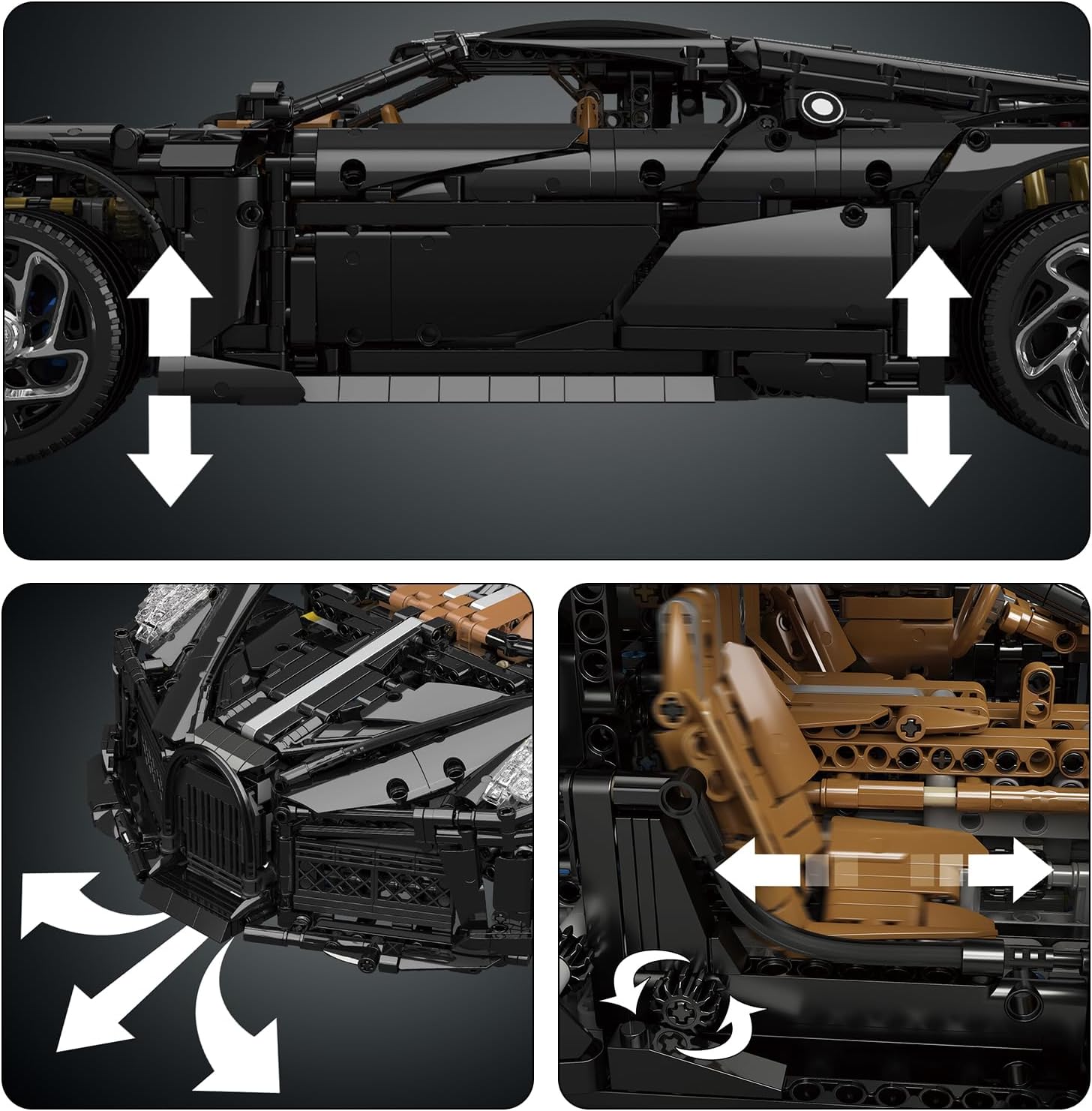 Besondere Merkmale: Das Modell verfügt über eine simulierte Radnabe und einen Heckflügel, der sich manuell anheben und absenken lässt. Die Motorhaube, die Heckabdeckung, die Türen und das Schiebedach des Sportwagens können geöffnet werden. Elektrisch anhebbares Fahrgestell: Das Fahrgestell des Autos kann elektrisch angehoben und abgesenkt werden, was das Modell noch realistischer macht. Verstellbarer Autositz: Der Autositz kann manuell verstellt werden, um die Sitzposition anzupassen.