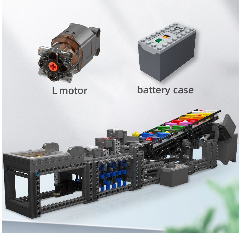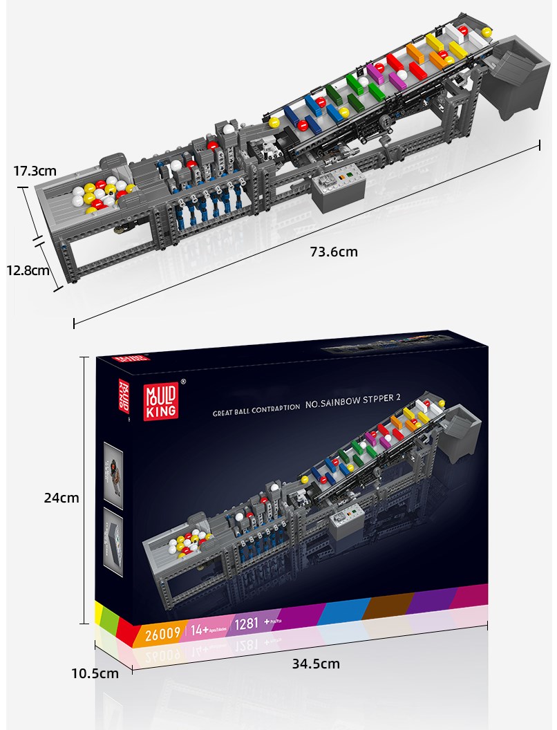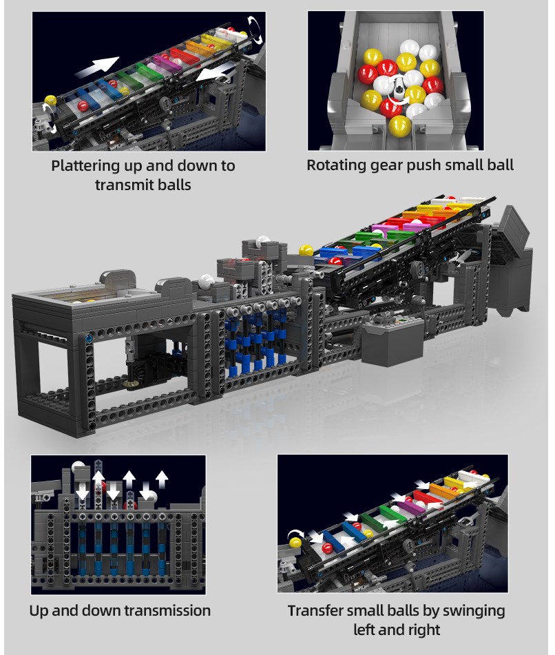 Das voll-motorisierte Set wird über einen L-Motor angetrieben, dessen einzige Funktion es ist Kugeln über einen Stufenmechanismus Schritt für Schritt um 18 Stufen nach oben zu befördern, ehe diese wieder in einen Auffangkorb rollen. Die farbliche Akzentuierung im Farbschema eines Regenbogens gibt diesem Modell die besondere optische Finesse.
