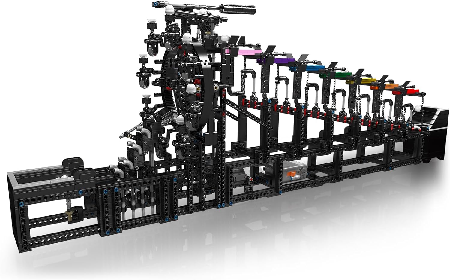 Das voll-motorisierte Set wird über einen XL-Motor angetrieben, dessen einzige Funktion es ist Kugeln über einen Hebemechanismus nach oben zu befördern, ehe diese über Rainbow-Tesengrity-Stufen wieder in einen Auffangkorb rollen. Die farbliche Akzentuierung im Farbschema eines Regenbogens gibt diesem Modell die besondere optische Finesse.