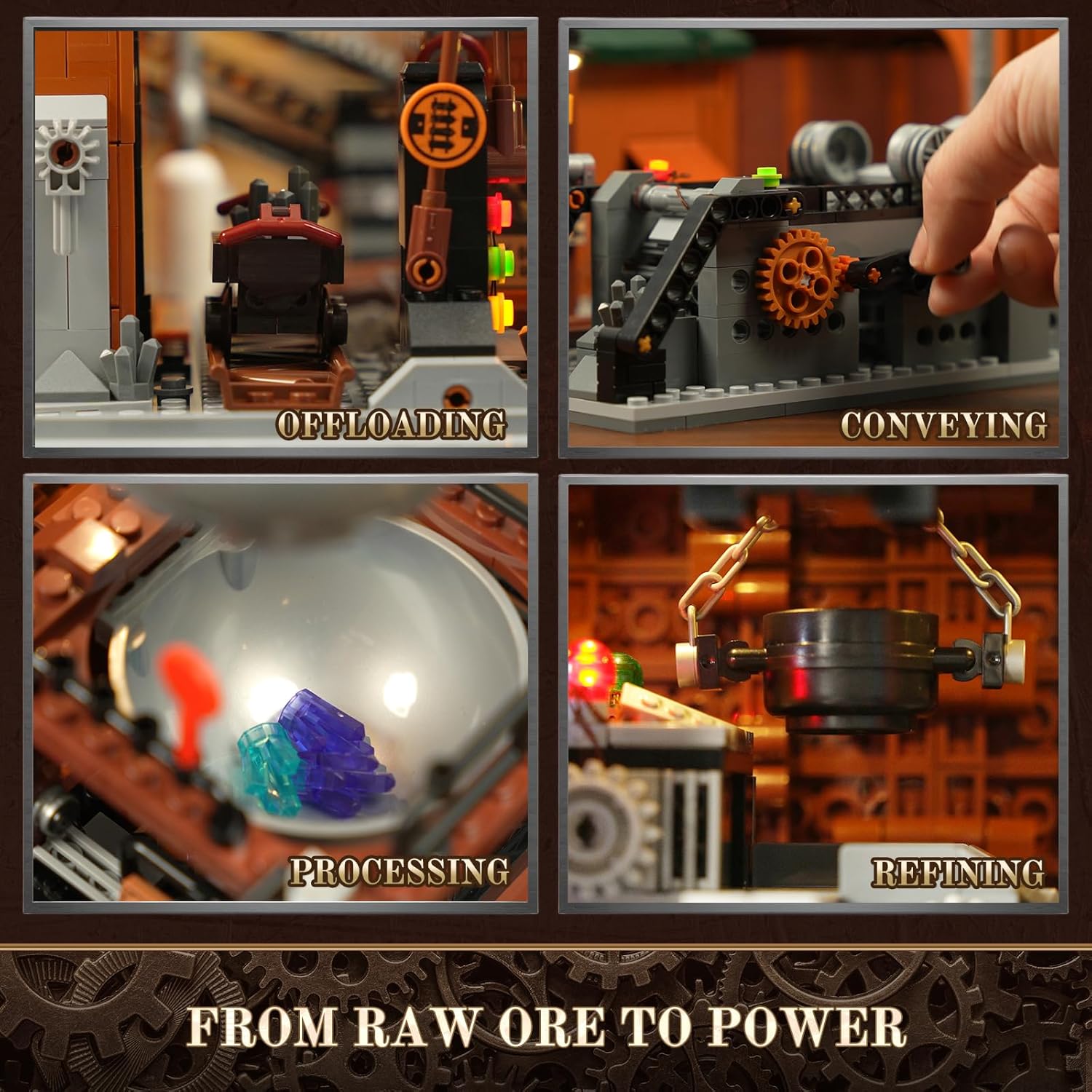 Technisch betrachtet ist die Steampunk Erzfabrik ein echtes Ingenieurskunstwerk. Ihr Herzstück bildet ein komplexes, manuell betriebenes Mechaniksystem, das einen vollständigen Fabrikprozess simuliert – inklusive Förderband, Schienensystem und funktionsfähigem Kran. Jeder Handgriff, jede Bewegung folgt einer inneren Logik, die das Modell lebendig erscheinen lässt. Unterstützt wird das Ganze von einem integrierten 27-Punkt-LED-Beleuchtungssystem, das mit roten, gelben und grünen Lichtern industrielles Leben in die Hallen zaubert. Der Bauprozess selbst ist anspruchsvoll, präzise und zutiefst befriedigend – ideal für erfahrene Baumeister, die Freude an technischer Raffinesse und feinen Details haben. Mit über 3.000 Teilen entsteht ein harmonisches Zusammenspiel aus Mechanik, Architektur und Licht.