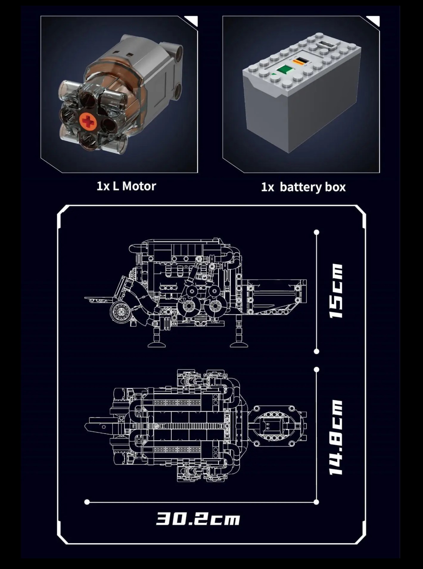 Motorgetriebenes Model eines W16-Zylinder Verbrennungsmotor. Beinhaltet einen L-Motor und eine Batteriebox.
