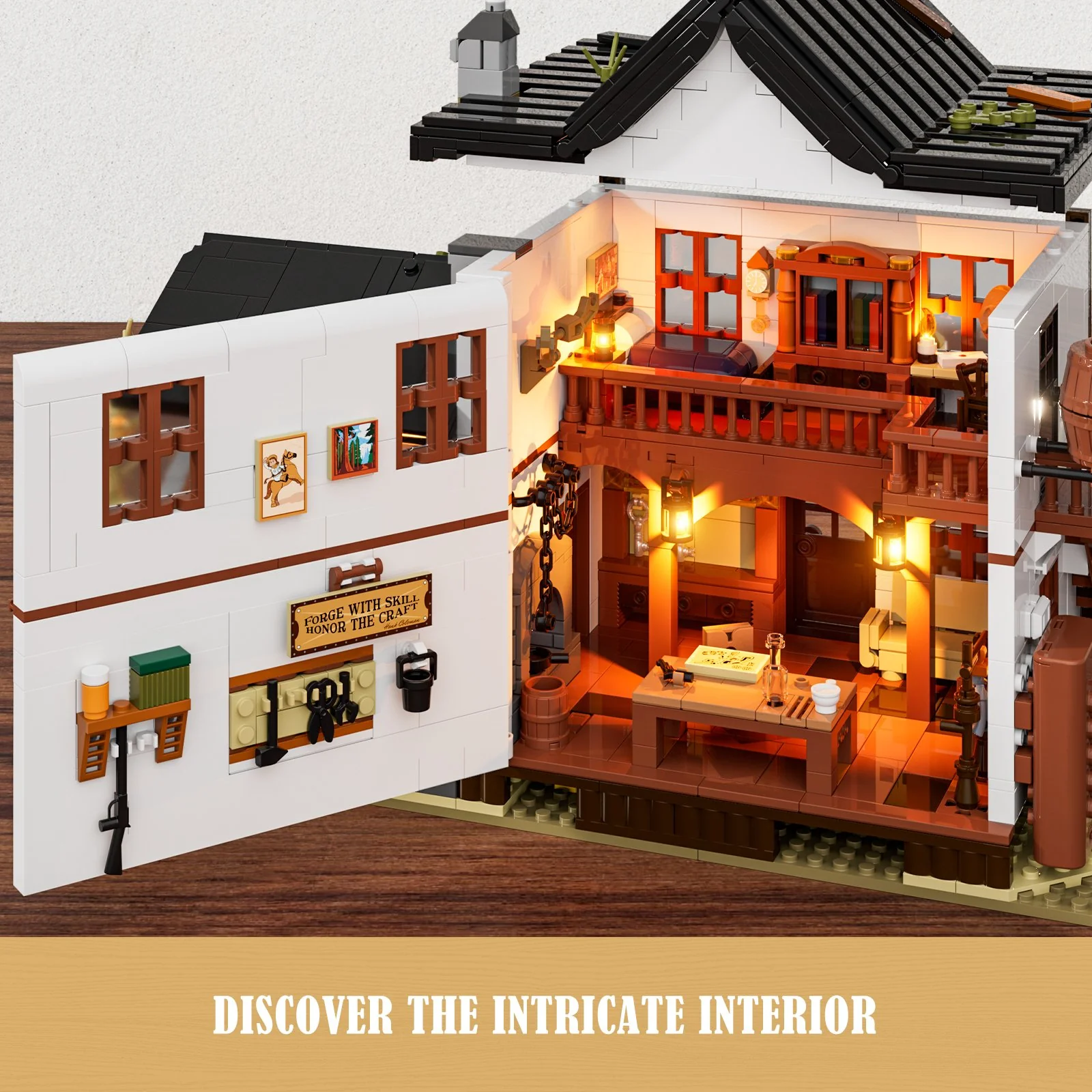 Technisch zeigt sich die Schmiede als wahres Meisterstück. Aus über 2.000 präzisen Teilen entsteht eine zweistöckige Werkstatt voller architektonischer Raffinesse. Die Rückwand lässt sich komplett öffnen, das Dach modular abnehmen – perfekt, um ins detailverliebte Interieur einzutauchen. Das Highlight ist das integrierte Beleuchtungssystem mit realistisch pulsierender Esse, deren warmes Licht Leben in das gesamte Modell bringt. Acht LEDs und vier Lichtleisten schaffen ein stimmungsvolles Schauspiel aus Schatten und Glut, das besonders bei Dunkelheit seine volle Wirkung entfaltet. Die bedruckten Elemente – von alten Steckbriefen bis hin zum Namensschild – verleihen dem Gebäude Patina und Charakter. Der Bau selbst ist fordernd, aber flüssig – ein meditativer Prozess, bei dem jedes fertige Modul wie ein kleiner Triumph wirkt.