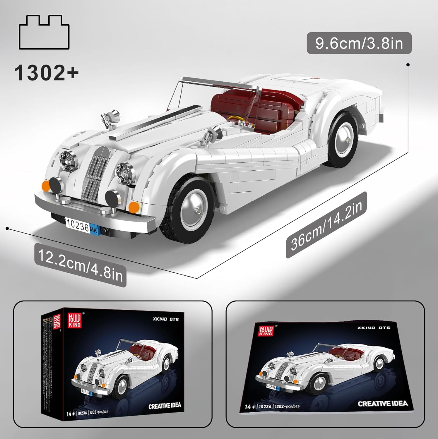 Formschönes Modell eines amerikanischen Oldtimers. In der Creativ Idea-Reihe von Mould King finden sich viele gelungenen Sportwagen und Oldtimer-Modellen fürs Regal oder die Vitrine. Vor allem der bekannte MOC-Designer Firas Abu-Jaber sorgt für ästhetisch ansprechenden Nachschub. Funktionen: Türen, die Motorhaube und der Kofferraum lassen sich öffnen, das Dach abnehmen. Die ikonische Karosserie-Farbe, sowie die stylischen Felgen und die imposante Motorhaube runden den Gesamteindruck ab. Wie immer bei Mould King sind die Steine nach Bauabschnitten in Tüten vorsortiert und die Anleitung leicht verständlich.