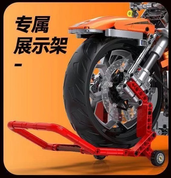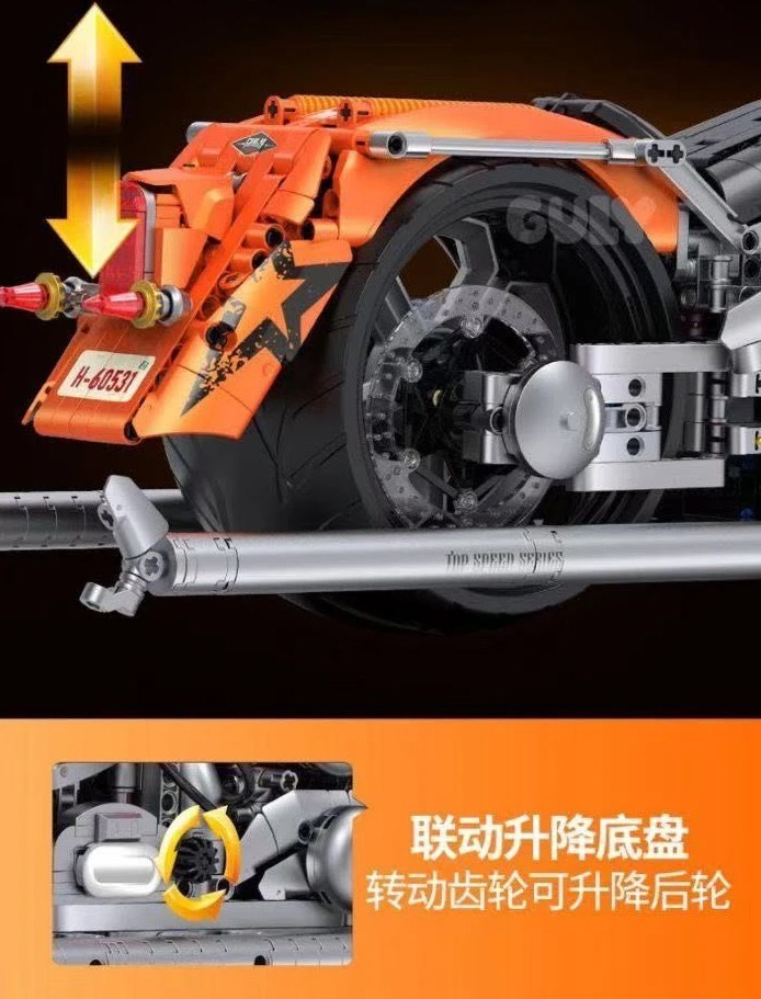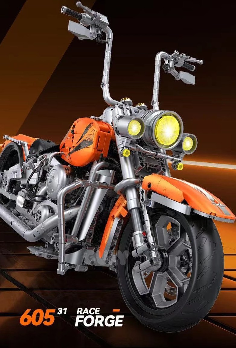 Die GULY Orange Chopper ist ein Technic-Modell im Maßstab 1:5, das die Essenz einer echten Harley einfängt. Mit seinem charakteristischen V2 und dem klassischen Profil liefert dieses Motorrad pure Freiheit in jedem Stein.