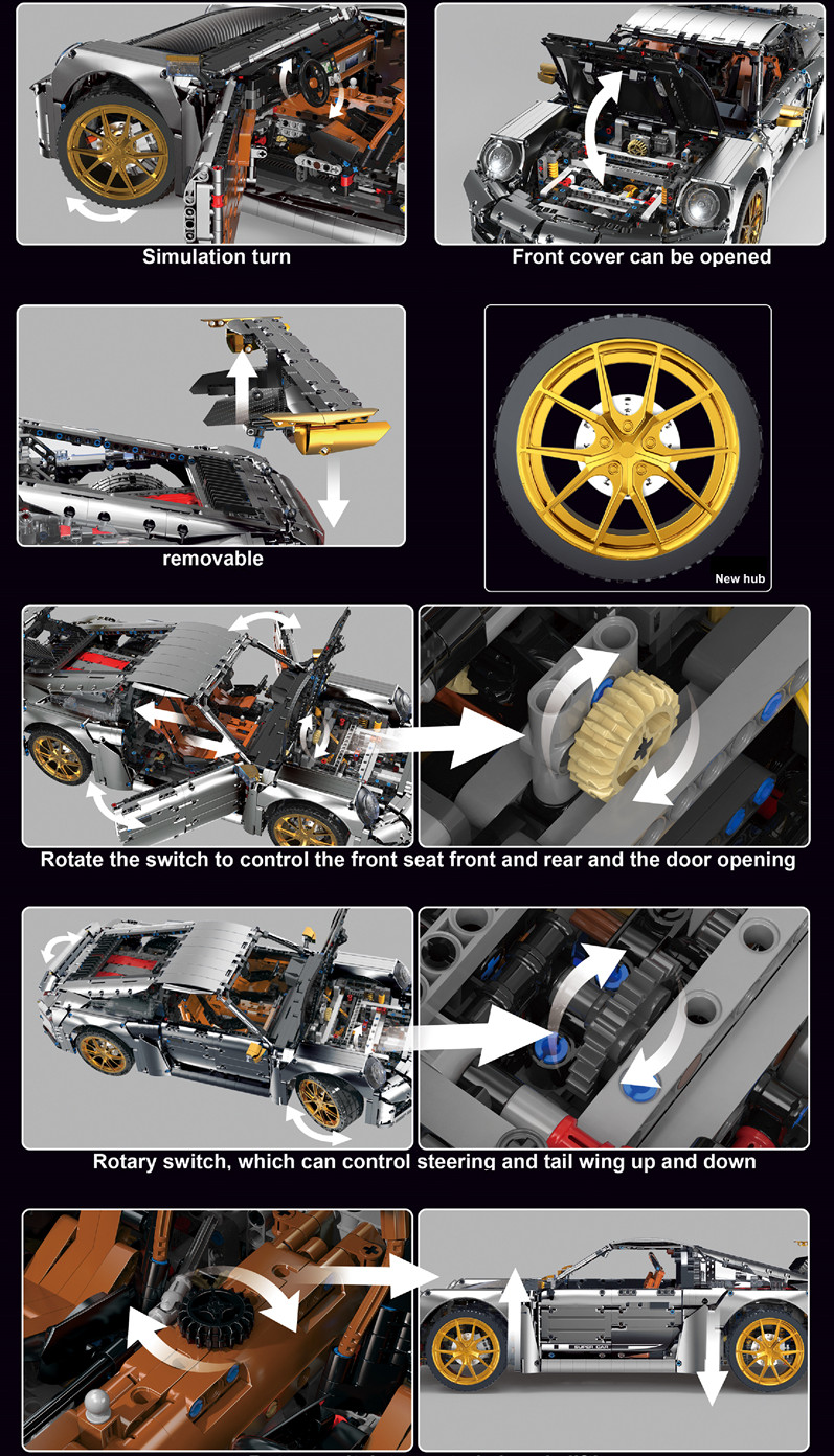 Der GULY 10630 GTR Sportwagen ist ein Technic-Modell im Maßstab 1:8, das die Essenz eines echten Nissan GTR einfängt. Mit seinen charakteristischen Frontscheinwerfern und dem aggressiven Profil liefert dieses GTR-Auto pure Rennenergie in jedem Stein. Eines seiner herausragenden Merkmale ist der automatisch verstellbare Heckflügel, der für einen Hauch von Realismus und aerodynamischer Funktion sorgt. Egal, ob Sie ein GTR-Fan, ein Sammler oder auf der Suche nach einem detaillierten GTR-Auto sind, dieses Modell vereint ikonischen Stil und technische Präzision in einem dynamischen 1:8 Model. Dynamic Version mit Power Functions und Beleuchtung. 65 Teile beklebt, 90 Teile bedruckt. Steine von JieStar