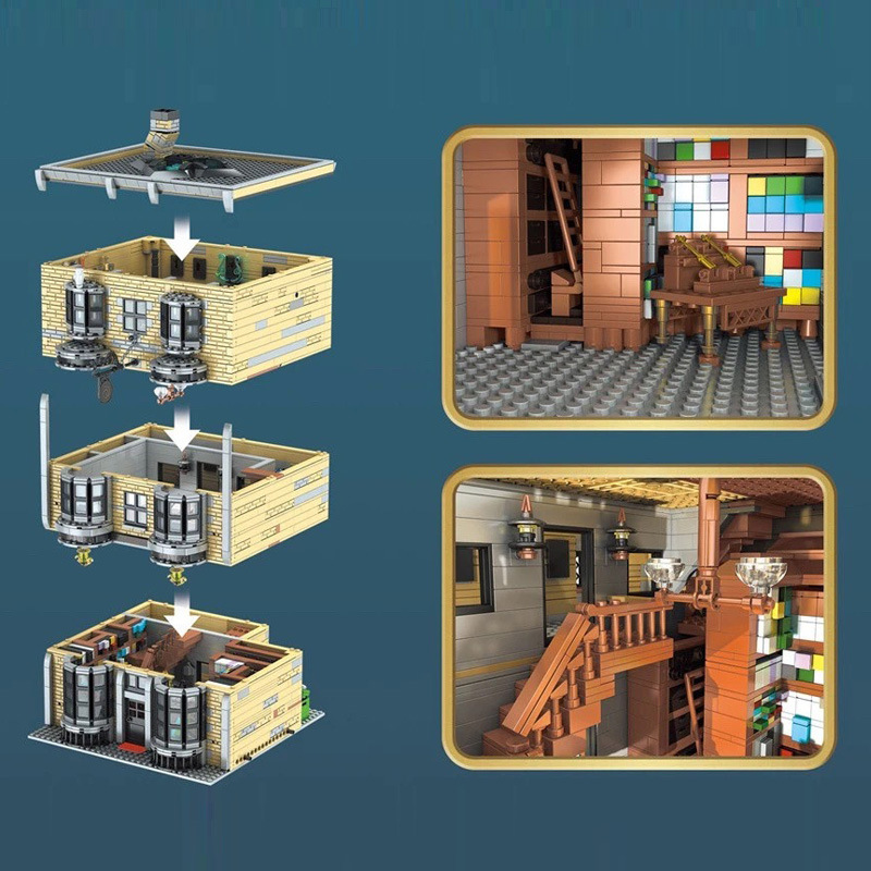 Dieses Allerheiligste (lt. Sanctum Sanctorium) hat es in sich. Auf 4 Ebenen plus Dach erstreckt sich ein modulares Gebäude der Extraklasse. Neben der imposanten Eingangshalle mit ihrer doppelfügigen Treppe warten noch drei weitere detailreiche Stockwerke auf ihre Fertigstellung und Entdeckung. Die gothische Fassade mit ihrer stimmigen grau/schwarz/braunen Farbgebung und imposanten Ausmaßen lädt zum Verweilen und Bestaunen ein. Dieses modulare Gebäude mit seinen 6632 Teilen ist nichts für Klemmbaustein-Anfänger, bietet jedoch aufgrund der guten Bauanleitung für alle Fortgeschrittene ein forderndes, interessantes und langes Bauvergnügen.LED Beleuchtung (8 x Steine) im Set enthalten.
