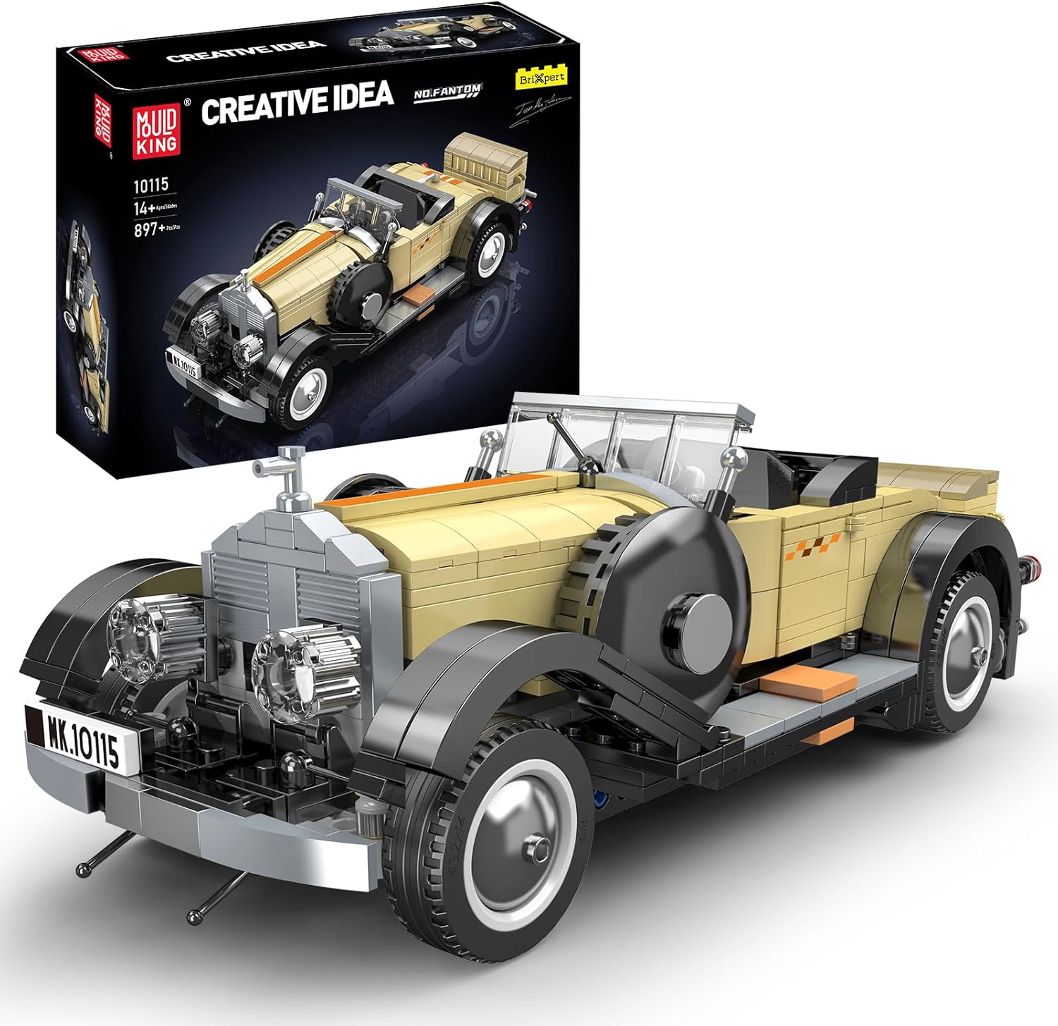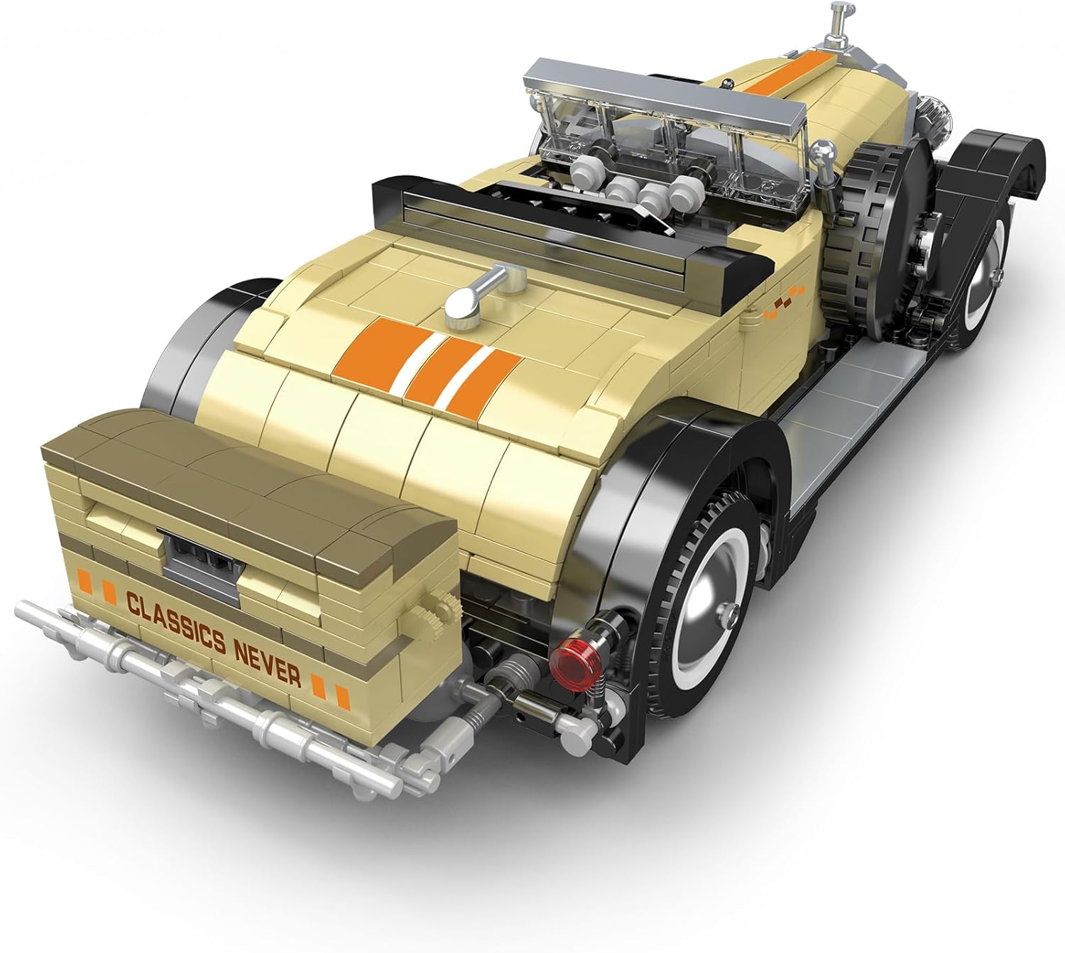 Formschönes Modell eines amerikanischen Oldtimers. In der Creativ Idea-Reihe von Mould King finden sich viele gelungenen Sportwagen und Oldtimer-Modellen fürs Regal oder die Vitrine. Vor allem der bekannte MOC-Designer Firas Abu-Jaber sorgt für ästhetisch ansprechenden Nachschub. Funktionen: Türen, die Motorhaube und der Kofferraum lassen sich öffnen, das Dach abnehmen. Die ikonische Karosserie-Farbe, sowie die stylischen Felgen und die imposante Motorhaube runden den Gesamteindruck ab. Wie immer bei Mould King sind die Steine nach Bauabschnitten in Tüten vorsortiert und die Anleitung leicht verständlich.