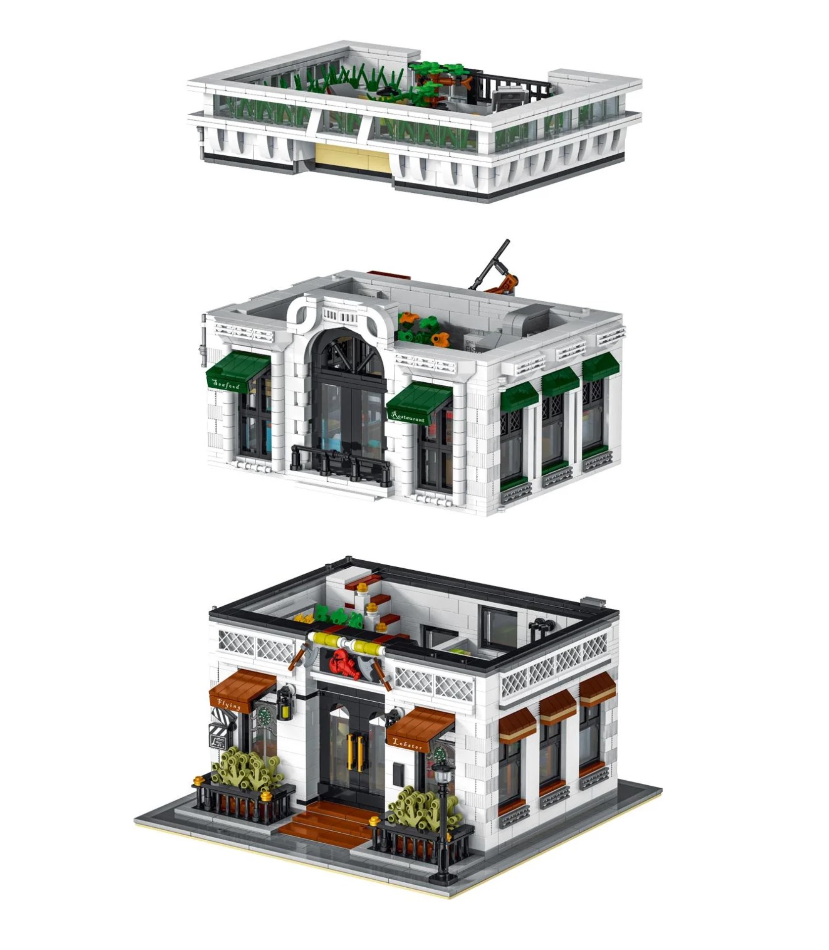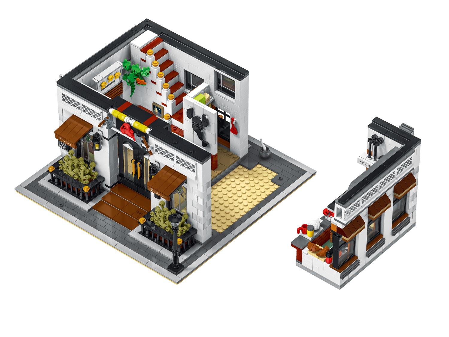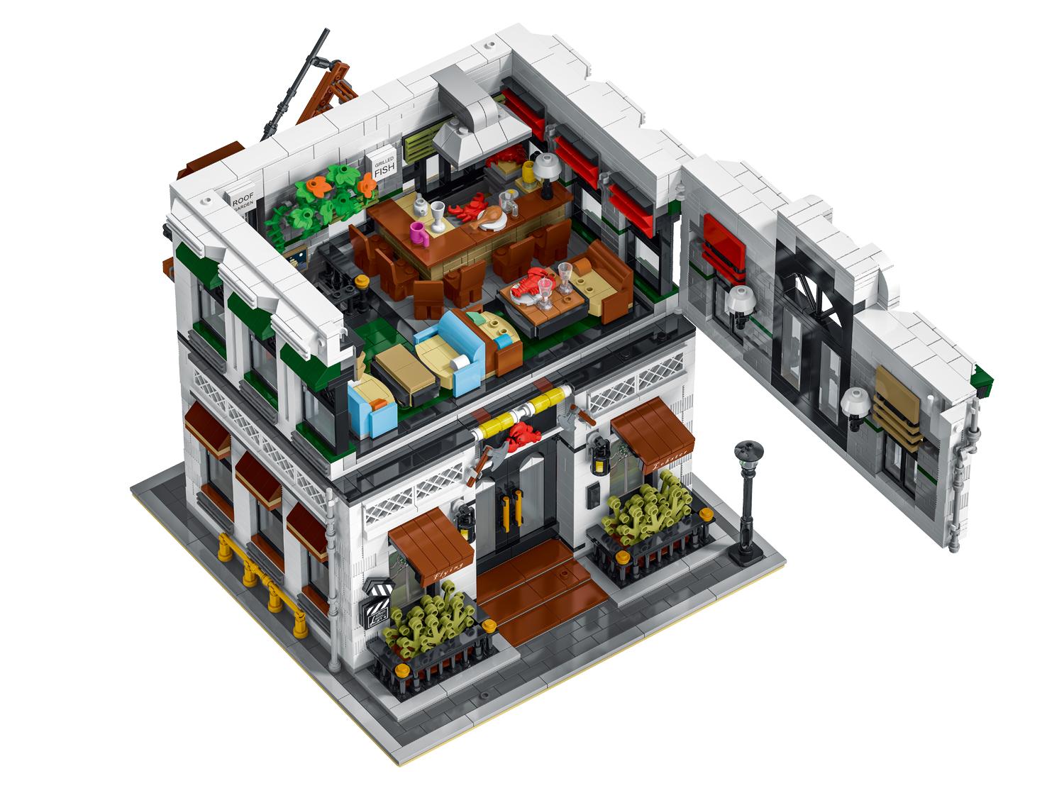 Parisian Restaurant - ein Pariser Restaurant in einem imposanten, modularem Gebäude aus Klemmbausteinen aus über 3100 Teilen. Ein außergewöhnliches und detailreiches Gebäude. Das Parisian Restaurant fügt sich schön in eine Stadt oder Straße ein, und der Bürgersteig davor kann nach Belieben verändert werden.