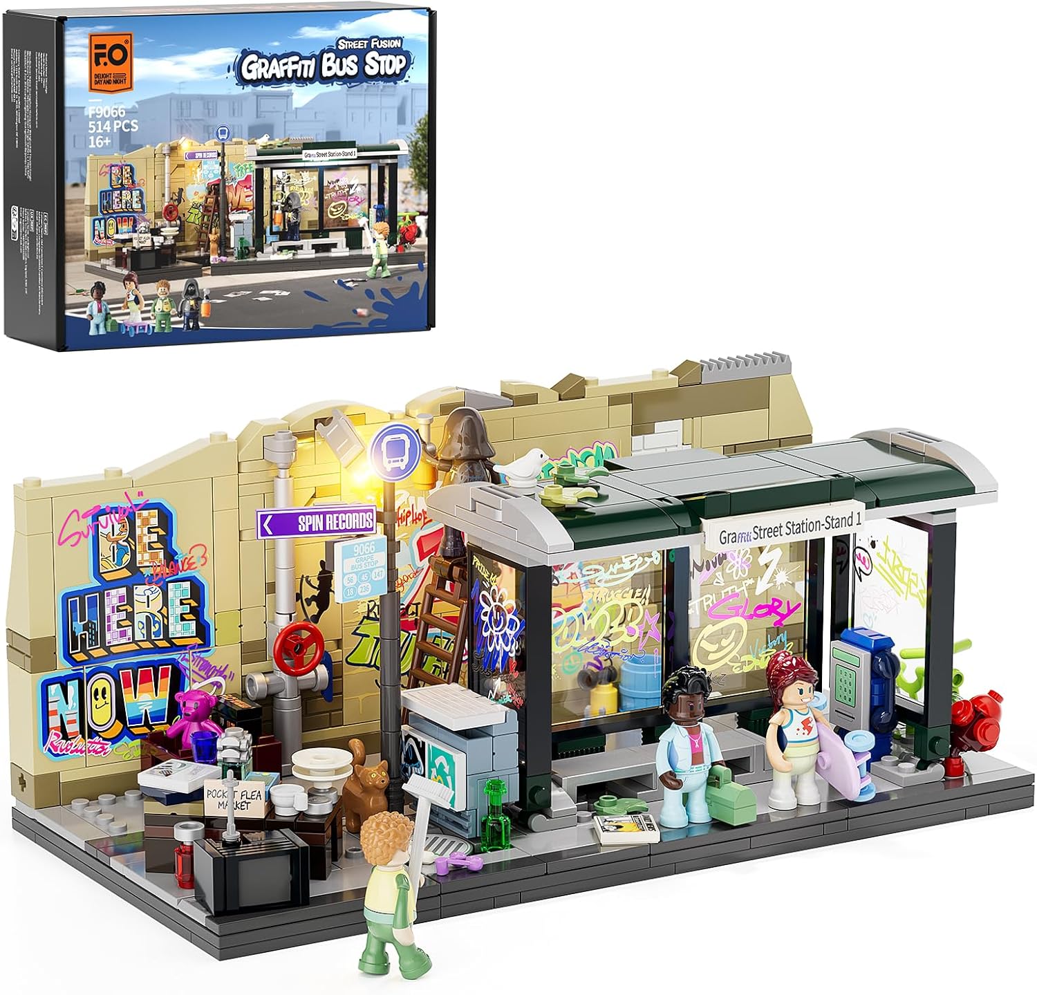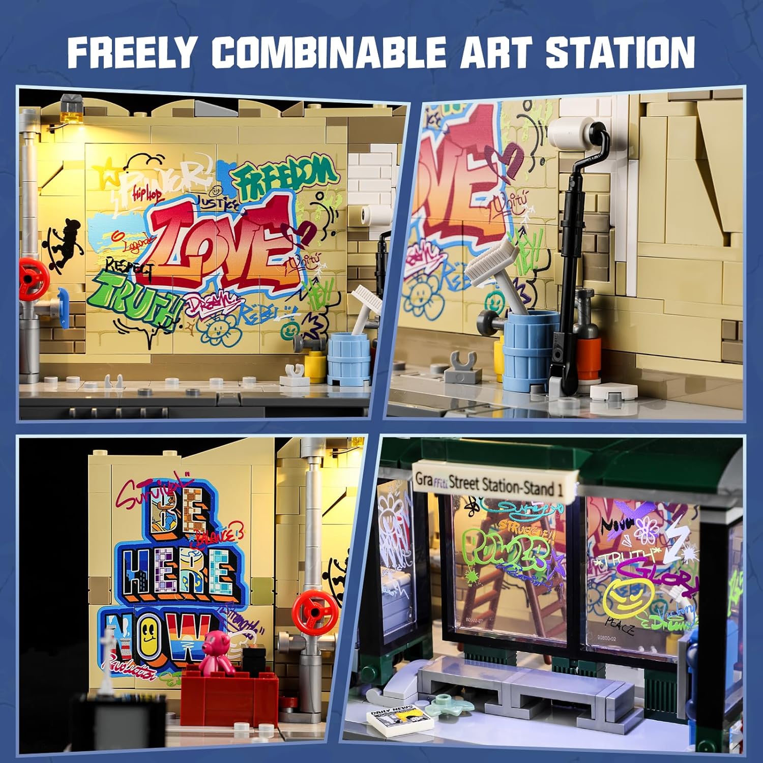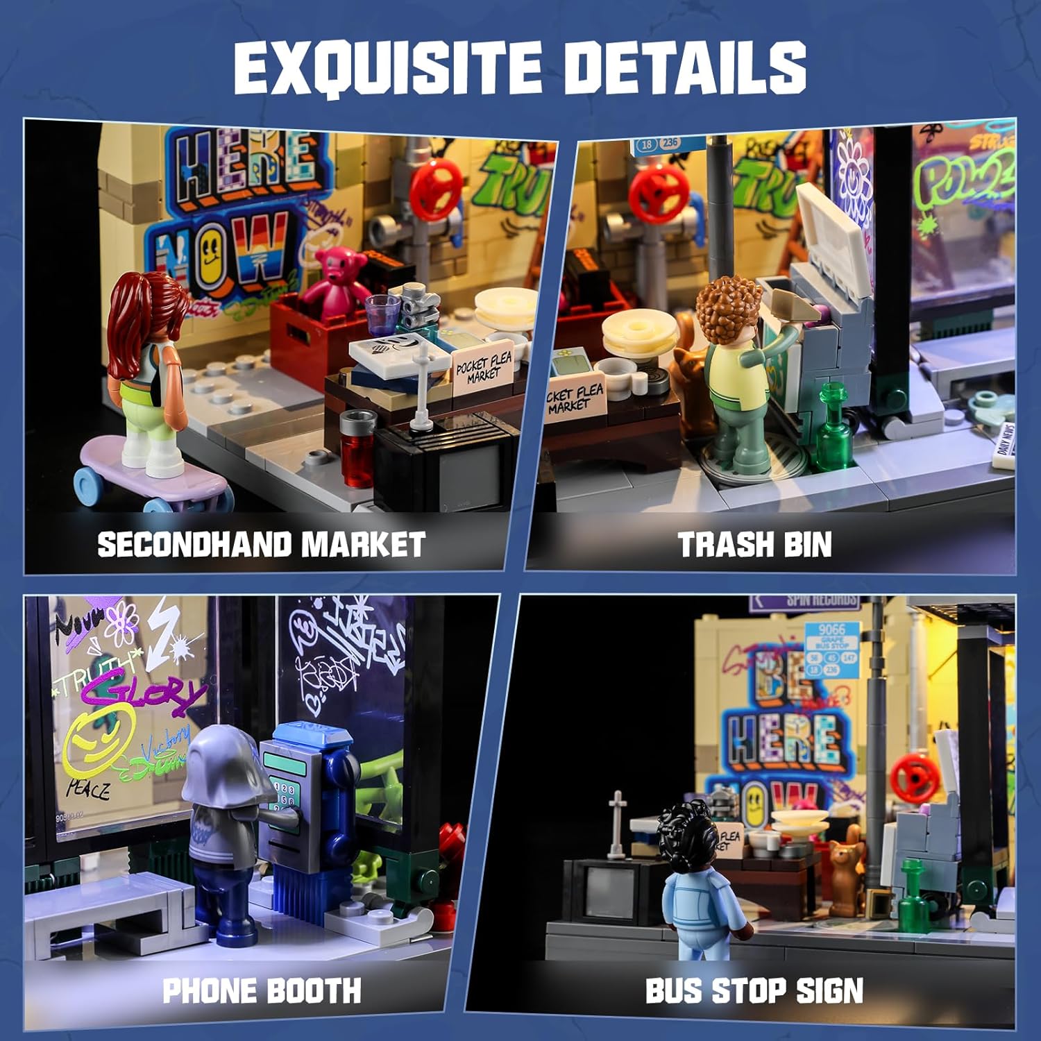 Das Set besteht aus drei kombinierbaren Modulen – Bushaltestelle, Graffiti-Wand und Flohmarktbereich – die sich flexibel platzieren und neu arrangieren lassen. Kleine Details wie Zeitungen auf dem Boden, Gullydeckel oder bemalte Mülleimer runden die Szene liebevoll ab. Zusätzlich dabei: charakterstarke Figuren im auffälligen Streetstyle sowie zwei Stickerbögen für individuelle Gestaltung. Mit 514 Teilen, 2 LED-Lichtern und klarer Anleitung ist das Set ideal für alle, die urbanen Realismus, Streetart und kreative Bauszenen lieben – ob als Einzelstück oder als Teil einer größeren Stadtlandschaft.