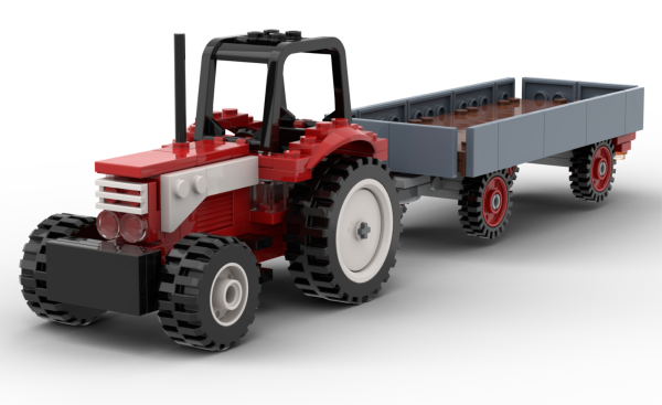Der große Traktor mit seinem praktischen Anhänger hilft bei Ernte, Stroh- und Heutransporten. Er passt ohne Anhänger in die Deele des Bauernhof-Stalls KC1108.