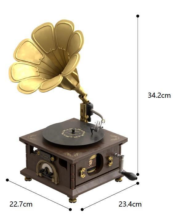 Retro Grammophone aus der Pantasy Retro-Reihe. Das Set besteht aus GoBricks-Steinen und beinhaltet nur Drucke im Stempeldruckverfahren, keinerlei Sticker.