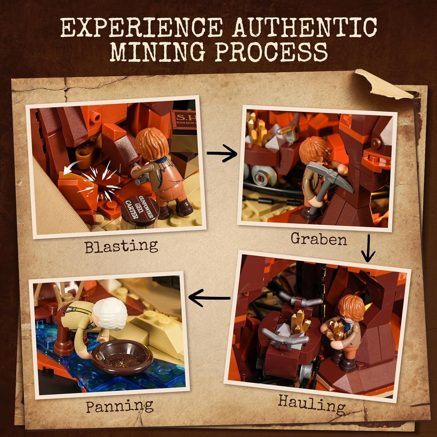 Mit dem Goldgräberlager aus der The Old West-Serie holst du dir den Wilden Westen direkt ins Regal. Auf 658 Teilen entsteht ein kleines, stimmungsvolles Camp mitten im staubigen Niemandsland. Zwischen Geröll und Kakteen haben sich die Pioniere niedergelassen: Ein einfaches Zelt dient als Unterkunft, daneben knistert ein Lagerfeuer, und rundherum stapeln sich Werkzeuge, Fässer und Vorräte für die harte Arbeit in der nahen Mine.